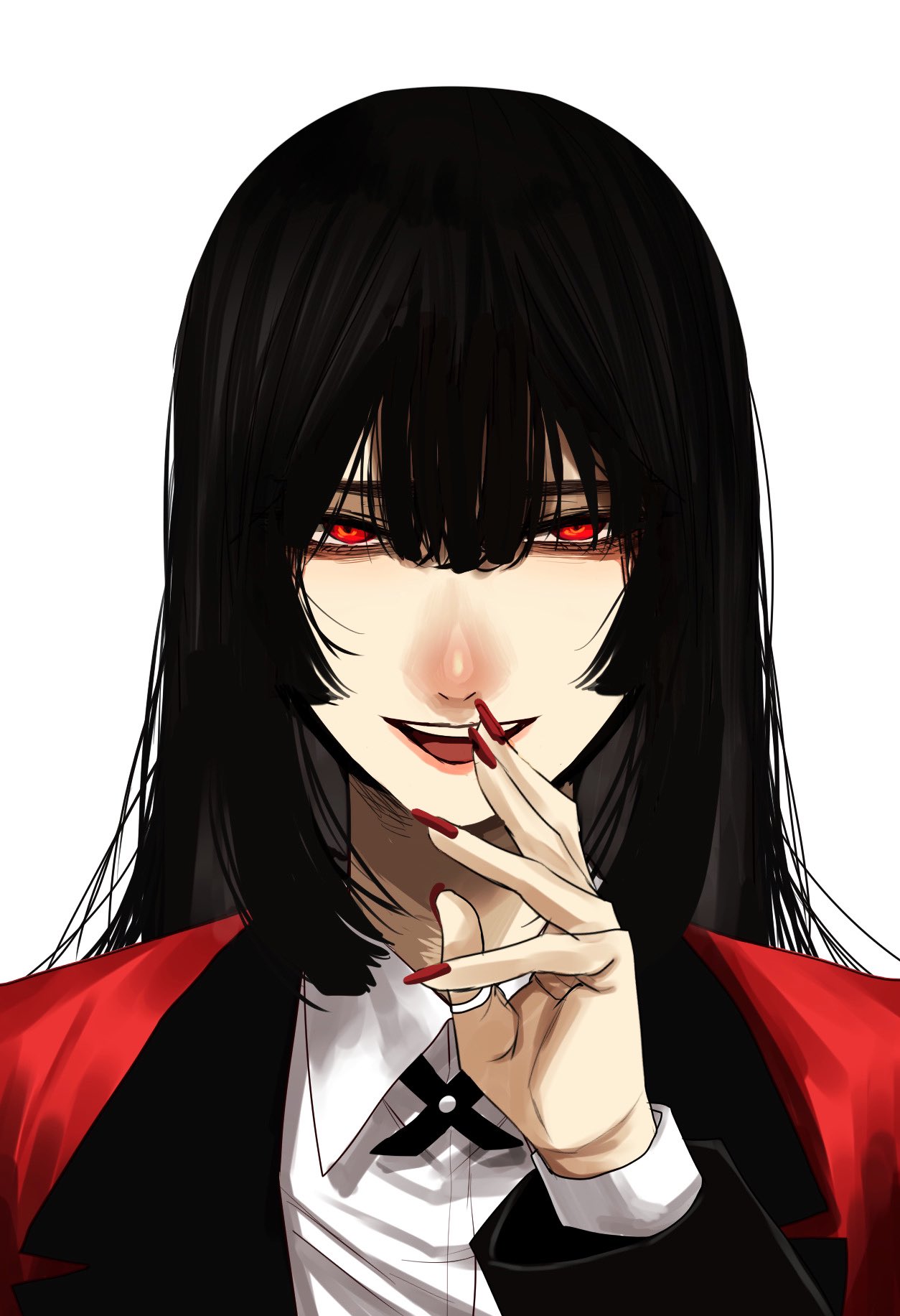 1girl :d black_hair fingernails gunjyou_(gunjyou_00) hand_up highres jabami_yumeko jacket kakegurui long_fingernails long_hair looking_at_viewer nail_polish open_mouth portrait red_eyes red_jacket red_nails shirt simple_background smile solo upper_body white_background white_shirt