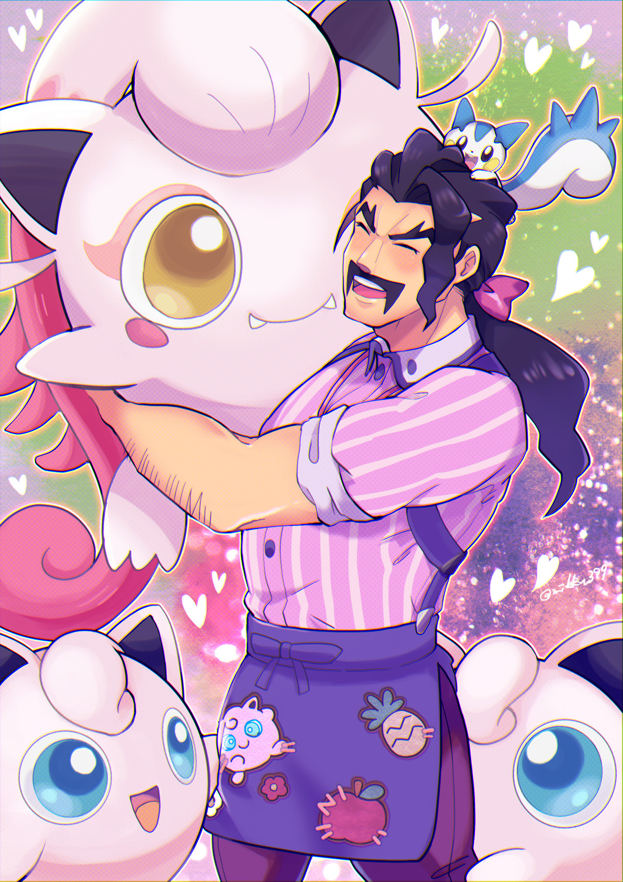 1boy :d apron arm_hair black_hair character_print closed_eyes collared_shirt commentary_request gen_1_pokemon gen_4_pokemon happy heart highres holding holding_pokemon jigglypuff long_hair male_focus mikku_(micpbwpicture) nintendo open_mouth pachirisu pants pink_shirt pokemon pokemon_(creature) pokemon_scarlet_and_violet purple_apron purple_pants saguaro_(pokemon) scream_tail shirt smile striped_clothes striped_shirt teeth thick_eyebrows tongue upper_teeth_only vertical-striped_clothes vertical-striped_shirt waist_apron