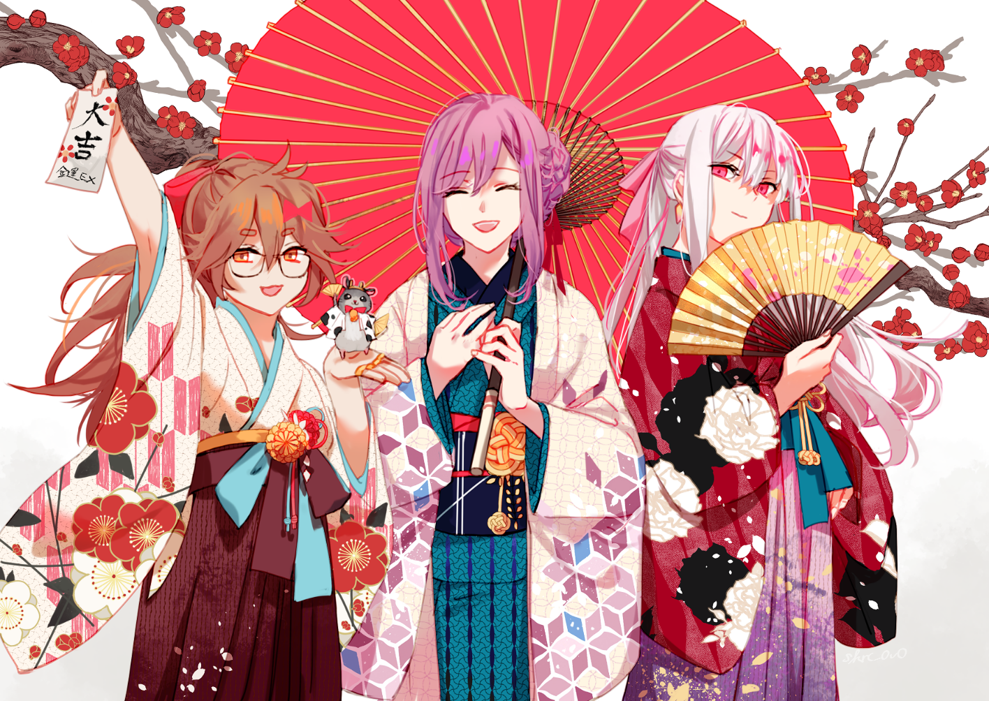 3girls :3 brown_eyes brown_hair cherry_blossoms closed_eyes earrings fate/grand_order fate_(series) ganesha_(fate) glasses hair_between_eyes hand_fan holding holding_umbrella japanese_clothes jewelry jinako_carigiri kama_(fate) long_hair looking_at_viewer matou_sakura mouse_(animal) multiple_girls parvati_(fate) ponytail purple_hair red_eyes red_ribbon red_umbrella ribbon sakuramochi1003 smile umbrella white_hair