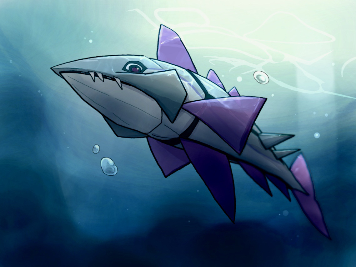 air_bubble animal_focus bubble commentary_request fangs fangs_out fish from_below full_body light_rays looking_down namakura_g nintendo no_humans pokemon pokemon_(creature) pokemon_focus solo underwater veluza