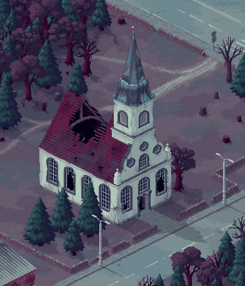 abandoned bare_tree broken_window building church commentary elenanazaire forest isometric lamppost nature no_humans original outdoors path pine_tree pixel_art road road_sign scenery shadow sign stone_wall street tree tree_stump wall window