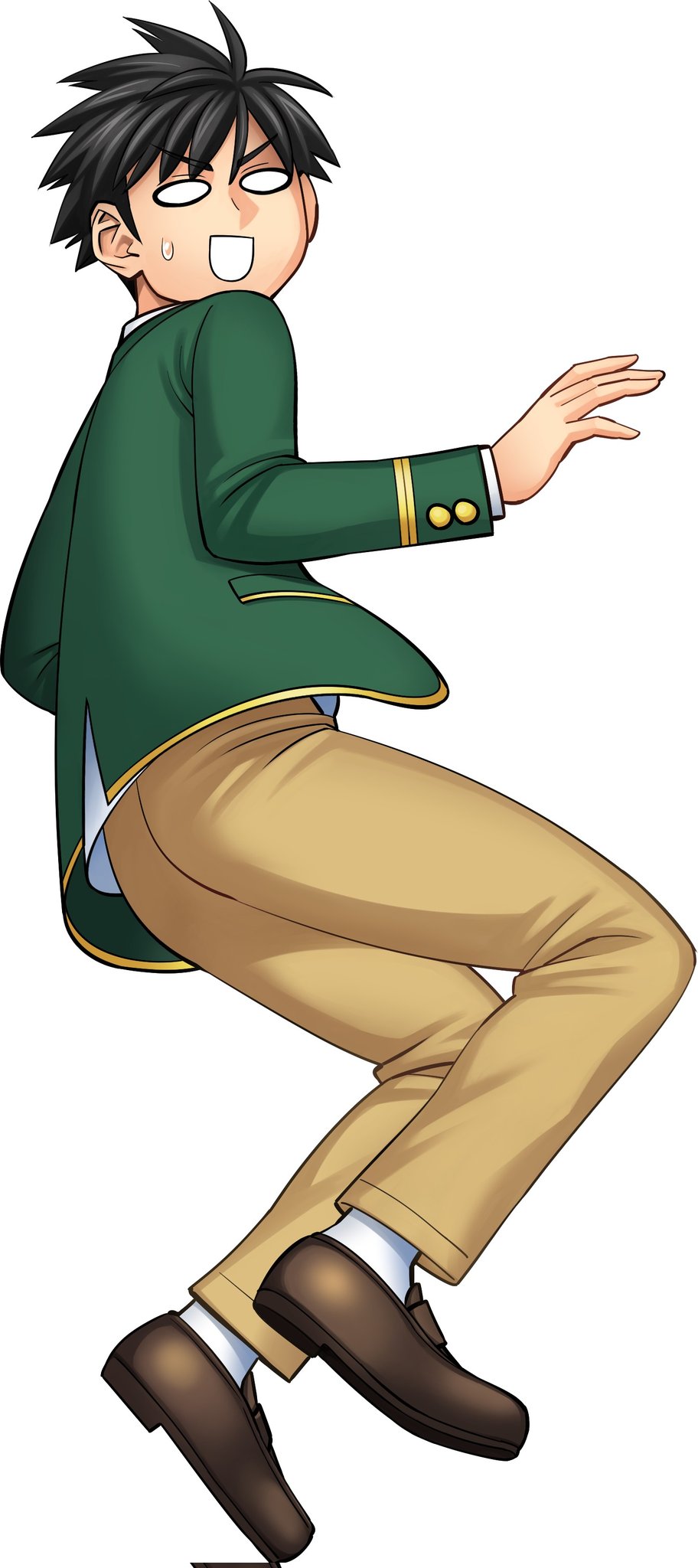 1boy black_hair blank_eyes brown_footwear highres kurusu_kimihito male_focus monster_musume_no_iru_nichijou okayado pants school_uniform shirt short_hair solo sweatdrop white_shirt
