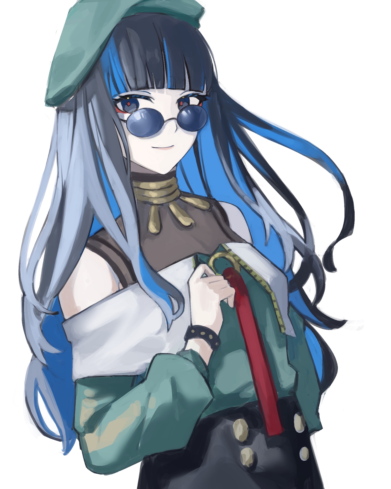 1girl beret black_hair blue-tinted_eyewear blue_hair blunt_bangs colored_inner_hair commentary_request fate/grand_order fate_(series) green_hat hat highres long_hair multicolored_hair omame_korokor simple_background solo sunglasses tenochtitlan_(fate) tenochtitlan_(second_ascension)_(fate) tinted_eyewear white_background