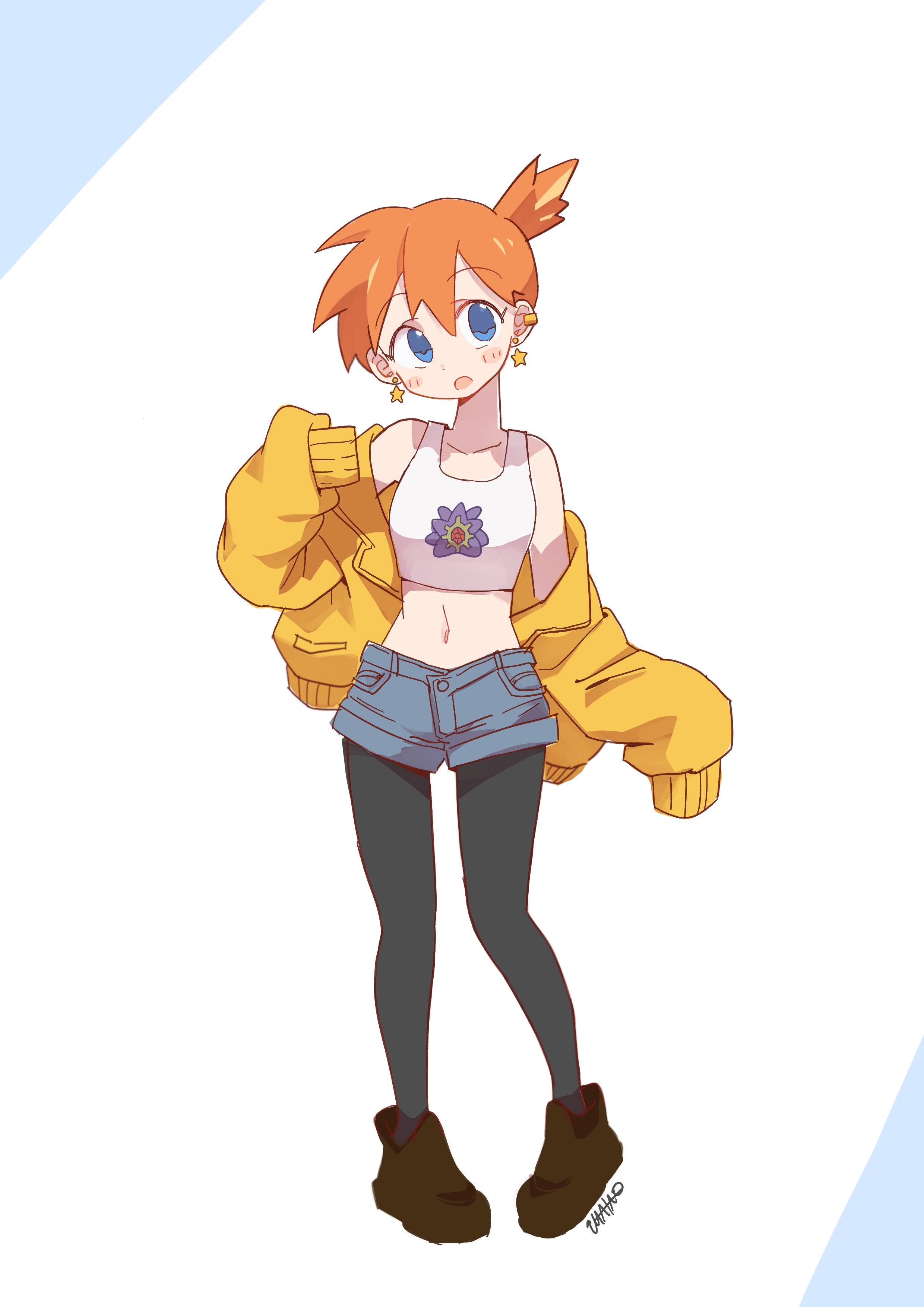1girl absurdres asymmetrical_hair bare_shoulders blue_eyes blush denim denim_shorts gen_1_pokemon gym_leader hair_tie highres jacket legs looking_at_viewer misty_(pokemon) navel nintendo open_mouth orange_hair pokemon pokemon:_let's_go_pikachu!_and_let's_go_eevee! ponytail shirt short_hair short_shorts shorts side_ponytail smile starmie sun_visor_(mata69) white_shirt