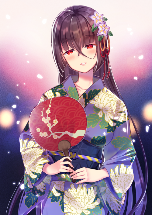 1girl bellflower blue_sash blush commentary_request facing_viewer floral_print flower hair_between_eyes hair_flower hair_ornament hand_fan holding holding_fan japanese_clothes kimono knot long_hair long_sleeves looking_at_viewer mutsu-no-kami_yoshiyuki_(tenka_hyakken) night obi obiage obijime okanoyuno open_mouth paper_fan parted_lips petals print_kimono purple_flower purple_hair red_eyes sash seigaiha sidelocks smile solo tenka_hyakken uchiwa very_long_hair wide_sleeves yukata