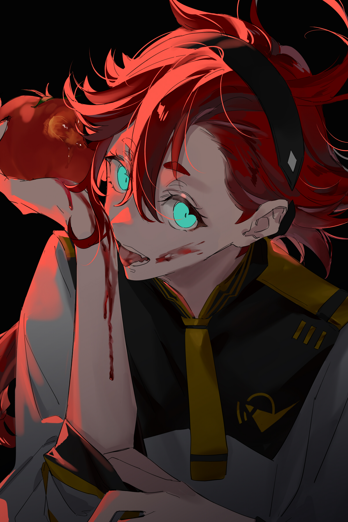 1girl ahoge ambiguous_red_liquid aqua_eyes asticassia_school_uniform black_background black_hairband fangs food gundam gundam_suisei_no_majo hair_between_eyes hairband high_collar highres holding holding_food jacket licking long_hair looking_at_viewer low_ponytail necktie open_mouth ponytail red_hair school_uniform shuu-0208 simple_background solo suletta_mercury swept_bangs thick_eyebrows tomato upper_body white_jacket yellow_necktie