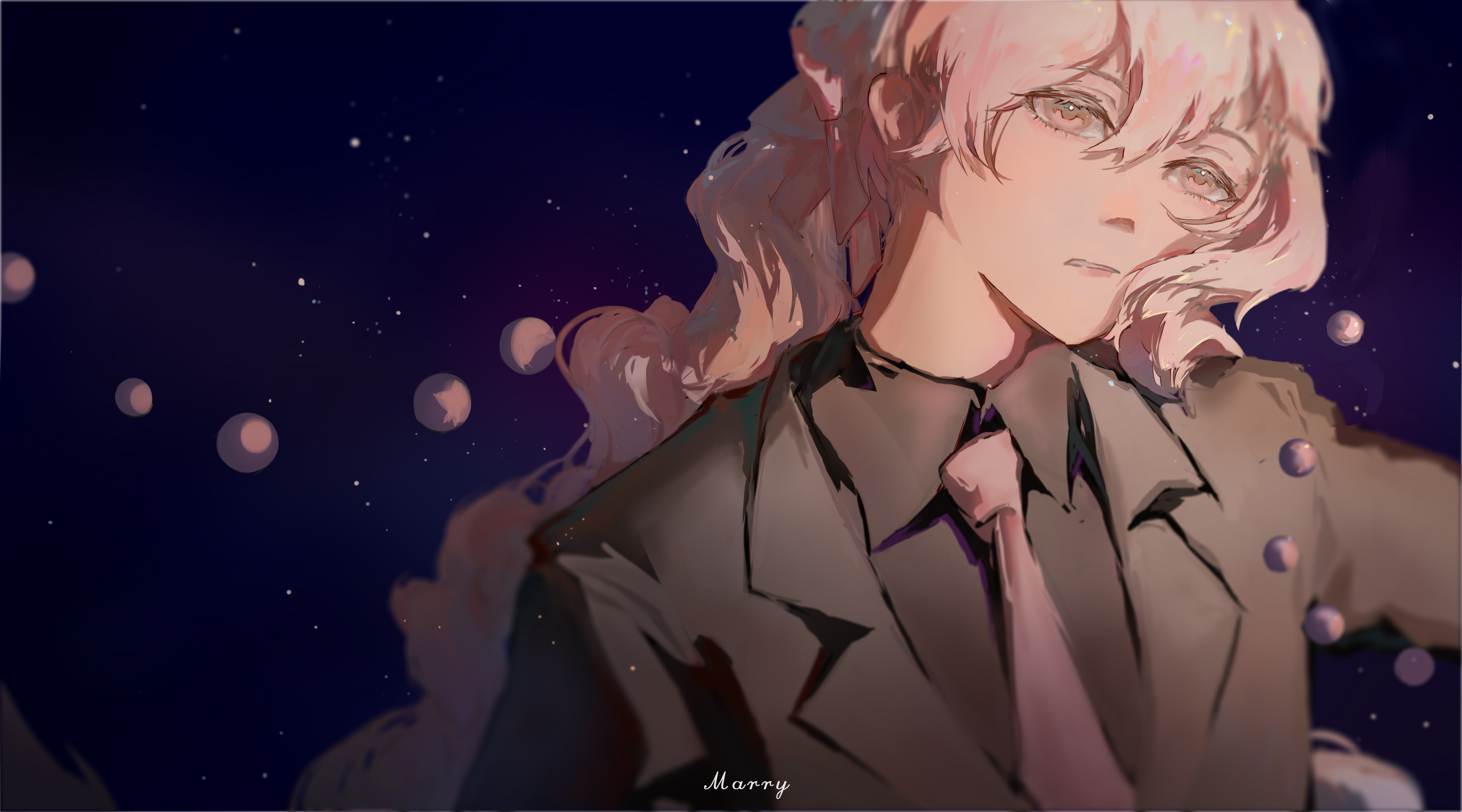 1girl absurdres aged_up alternate_costume baililiwan black_jacket black_shirt character_name chinese_commentary collared_shirt colored_eyelashes commentary dress_shirt eyelashes formal_clothes hair_between_eyes highres jacket kagerou_project kozakura_marry long_hair mekakucity_actors necktie night no_hairband no_ribbon parted_lips pink_eyes pink_necktie shirt sketch sky solo star_(sky) starry_sky suit suit_jacket upper_body wavy_hair white_hair