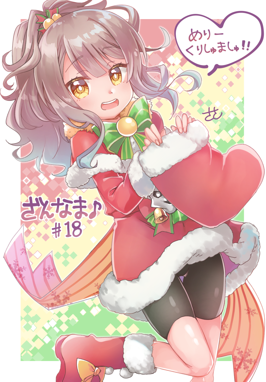 1girl bell bike_shorts boots bow bowtie brown_eyes grey_hair highres holding long_sleeves open_mouth ponytail santa_boots santa_costume shishiou_(tenka_hyakken) signature smile socks speech_bubble ssk_sasasa standing standing_on_one_leg tenka_hyakken