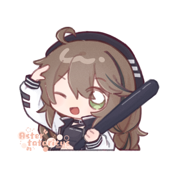 1girl ;d ahoge arknights arm_up artist_name baseball_bat beret black_hat black_jacket black_shirt brown_hair chibi cropped_torso cuora_(arknights) green_eyes hair_between_eyes hat holding holding_baseball_bat jacket kkkkuro looking_at_viewer multicolored_hair one_eye_closed open_clothes open_jacket open_mouth shirt simple_background smile solo streaked_hair upper_body white_background
