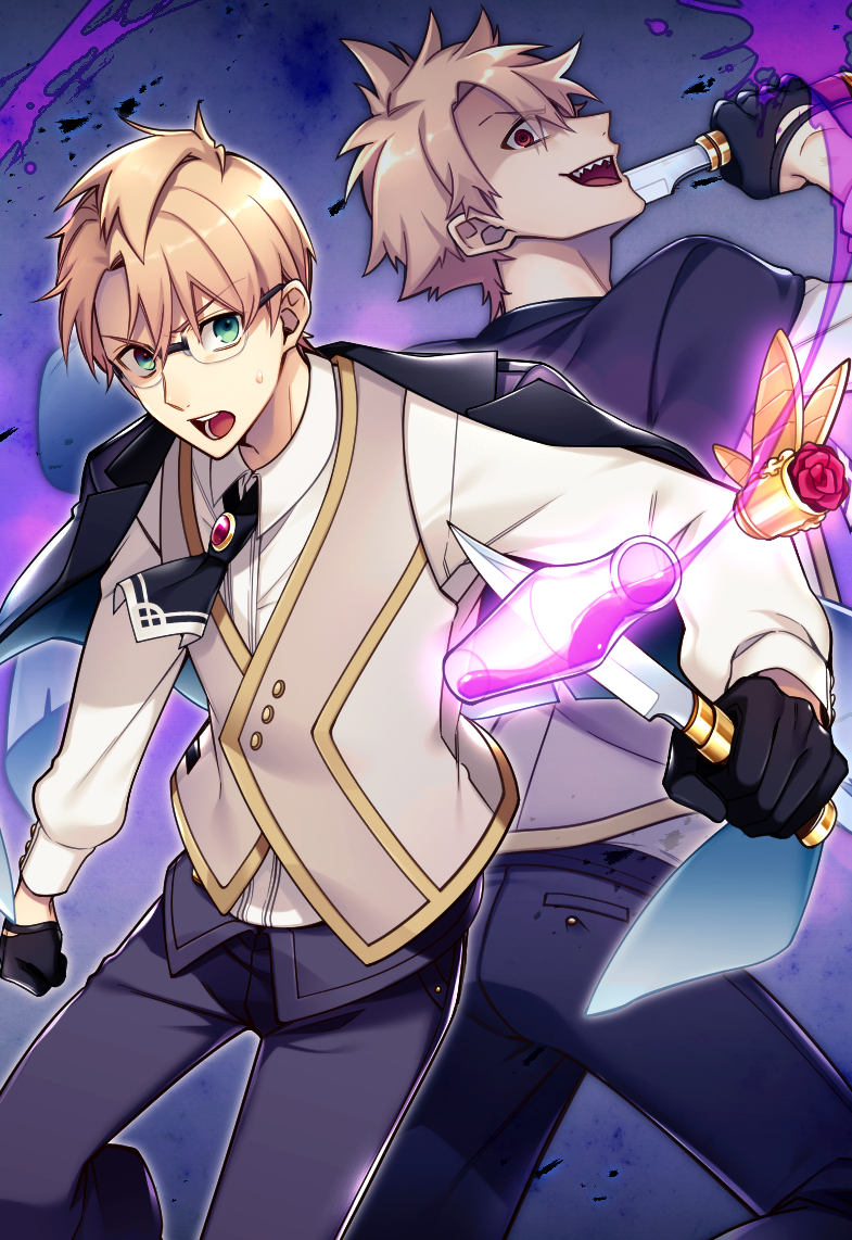 2boys :d ascot back-to-back black_ascot black_gloves black_jacket black_pants blonde_hair brooch clenched_hand collared_shirt crazy_eyes dual_persona fate/grand_order fate_(series) feet_out_of_frame glasses gloves green_eyes grey_background grey_vest hair_between_eyes half_gloves henry_jekyll_(fate) holding holding_knife hyde_(fate) jacket jacket_on_shoulders jekyll_and_hyde_(fate) jewelry knife looking_at_viewer looking_back male_focus miyama_rio multiple_boys open_mouth pants potion red_eyes sharp_teeth shirt short_hair smile spiked_hair spilling splatter_background sweatdrop teeth vest vial white_shirt