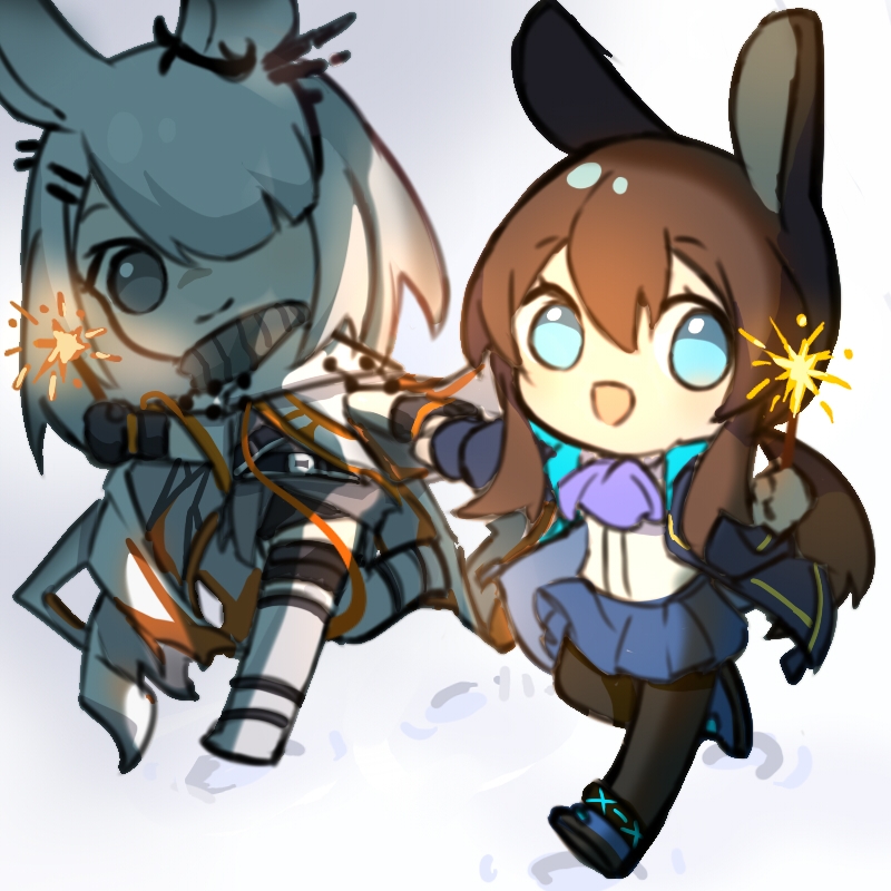 2girls :d amiya_(arknights) arknights ascot black_gloves black_jacket black_pantyhose blue_eyes blue_footwear blue_skirt boots brown_hair chibi closed_mouth commentary_request fireworks footprints frostnova_(arknights) ghost794 gloves gradient_background grey_background grey_eyes hair_between_eyes hair_over_one_eye holding holding_fireworks holding_hands jacket multiple_girls open_clothes open_jacket open_mouth pantyhose pleated_skirt purple_ascot running senkou_hanabi shirt shoe_soles shoes skirt smile snow sparkler white_background white_footwear white_hair white_jacket white_shirt