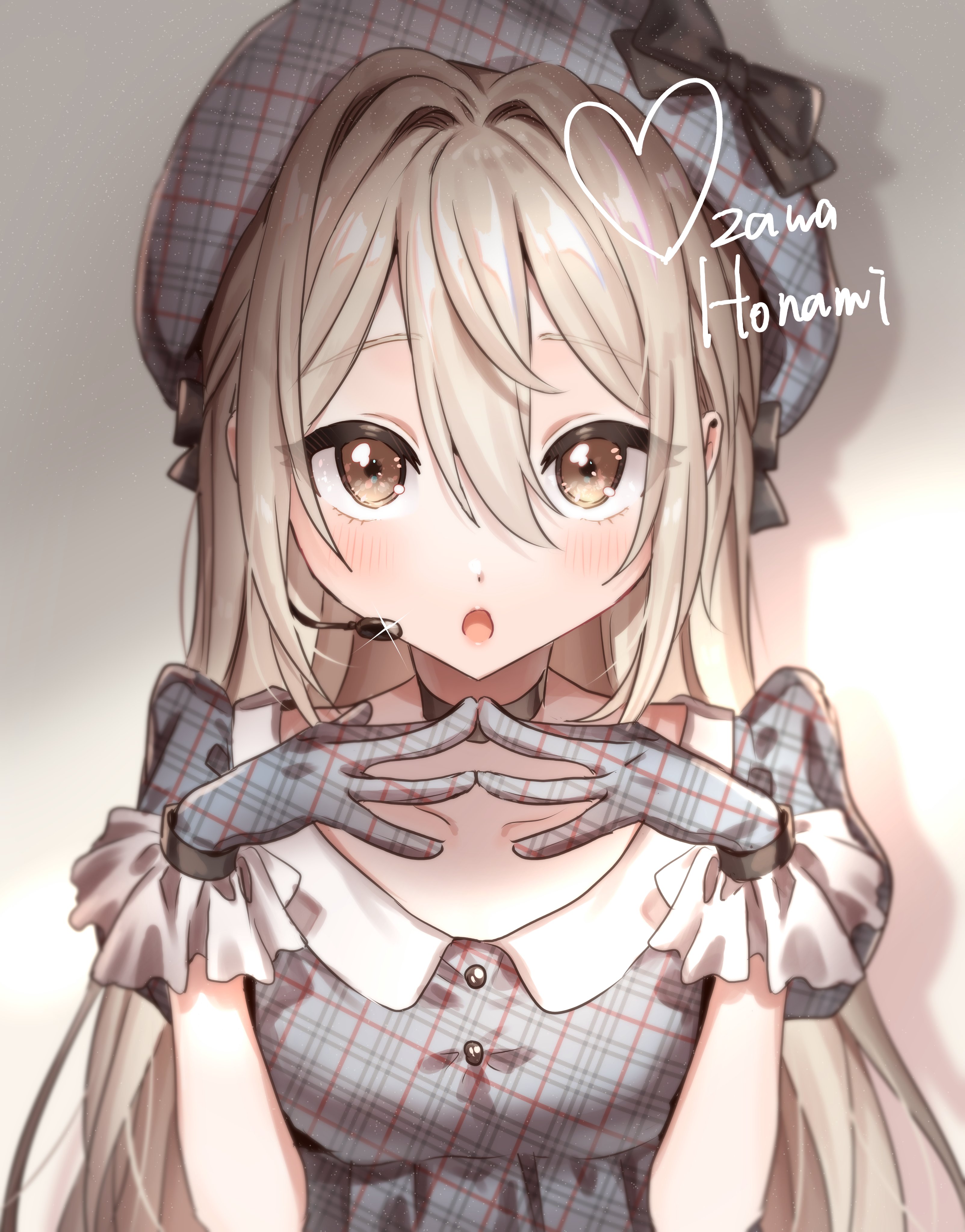 1girl absurdres aizawa_honami beret black_choker blush bow brown_eyes character_name choker dress earpiece female_focus frills gloves grey_dress grey_gloves grey_hat hair_between_eyes hat highres idol light_brown_hair long_hair looking_at_viewer loveodoro mietemasu_yo!_aizawa-san official_art open_mouth plaid_clothes plaid_dress plaid_gloves plaid_hat ribbon solo upper_body