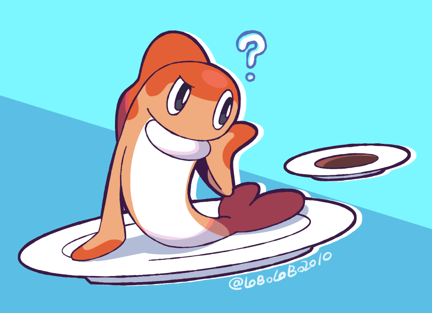 ? black_eyes bright_pupils commentary_request fish looking_back momoji_(lobolobo2010) nintendo no_humans plate pokemon pokemon_(creature) solo tatsugiri tatsugiri_(curly) twitter_username watermark white_pupils