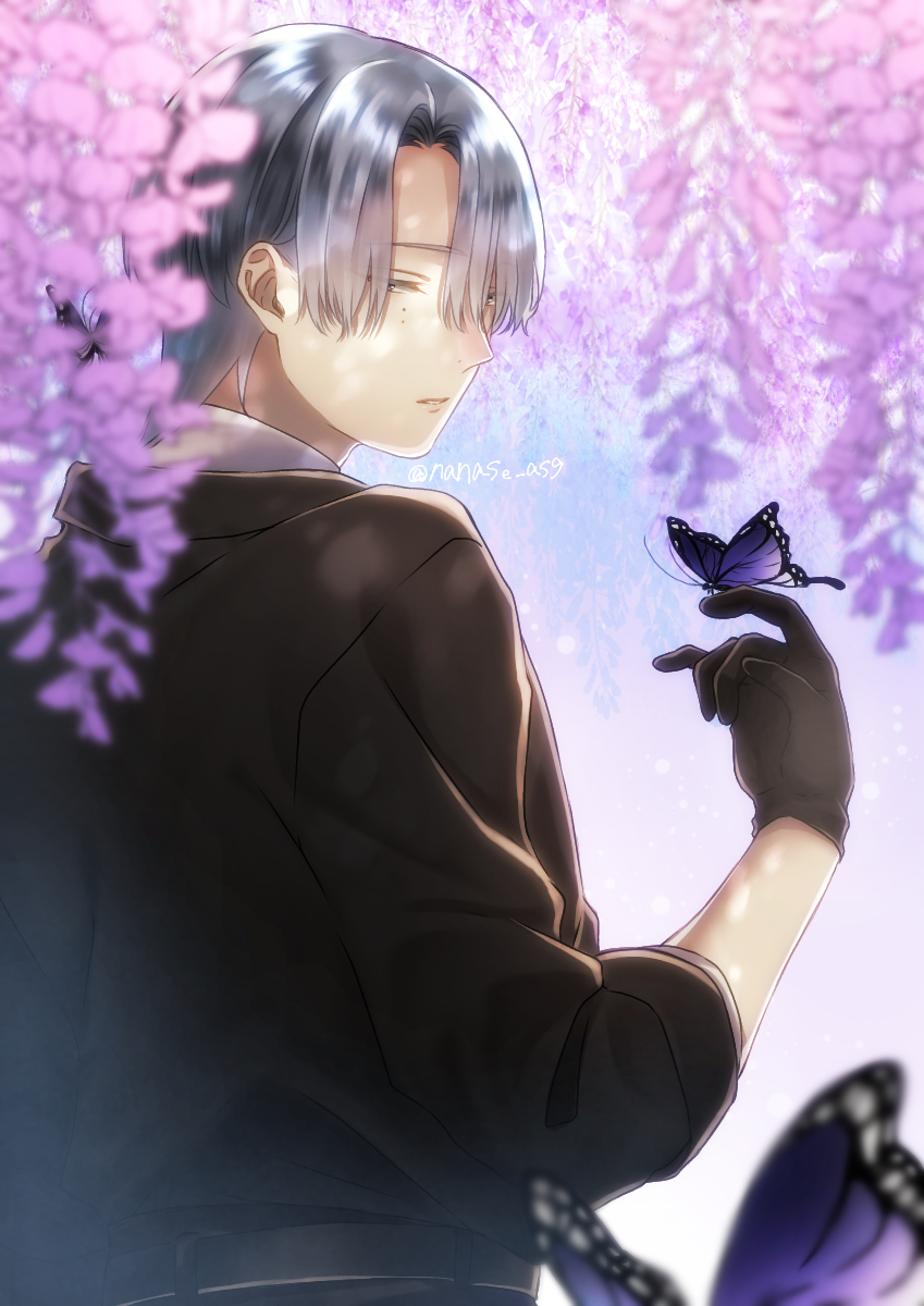 1boy asagi_nanase blue_sky brown_gloves brown_jacket bug butterfly butterfly_on_hand cherry_blossoms gloves grey_eyes grey_hair highres insect jacket kirisaki_shidou long_sleeves looking_at_viewer looking_back male_focus milgram mole mole_under_eye parted_lips purple_butterfly short_hair sky solo