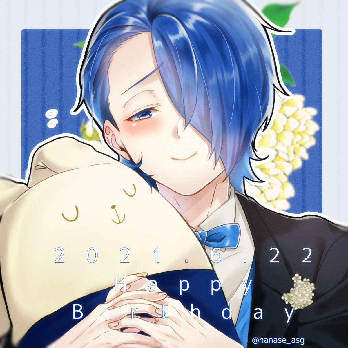 1boy asagi_nanase blue_eyes blue_hair blue_necktie closed_mouth collared_shirt dated formal_clothes hair_over_one_eye happy_birthday highres long_sleeves looking_at_viewer male_focus milgram necktie one_eye_covered sakurai_haruka_(milgram) shirt short_hair smile solo suit white_shirt