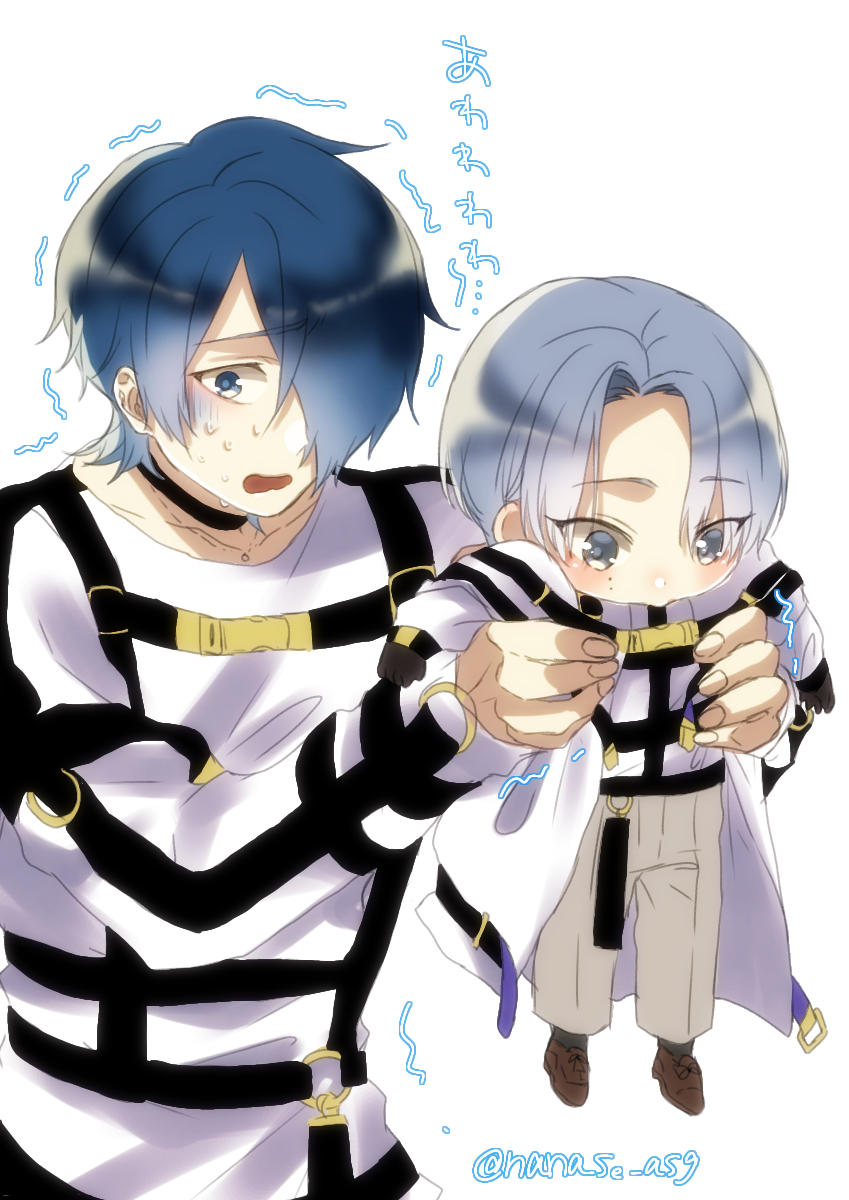 2boys asagi_nanase baby blue_eyes blue_hair carrying_baby carrying_person hair_over_one_eye highres jacket kirisaki_shidou long_sleeves looking_at_viewer milgram multiple_boys nervous one_eye_covered sakurai_haruka_(milgram) short_hair translation_request twitter_username white_background white_jacket