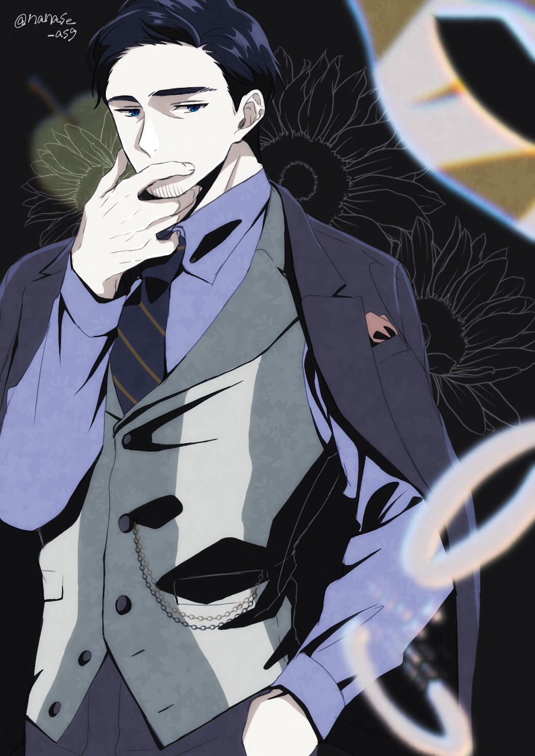 1boy asagi_nanase black_background black_hair black_jacket blue_eyes blue_necktie blue_shirt collared_shirt facial_hair floral_background grey_vest highres jacket long_sleeves looking_at_viewer male_focus milgram mukuhara_kazui necktie shirt short_hair solo striped_clothes striped_necktie twitter_username vest yellow_necktie