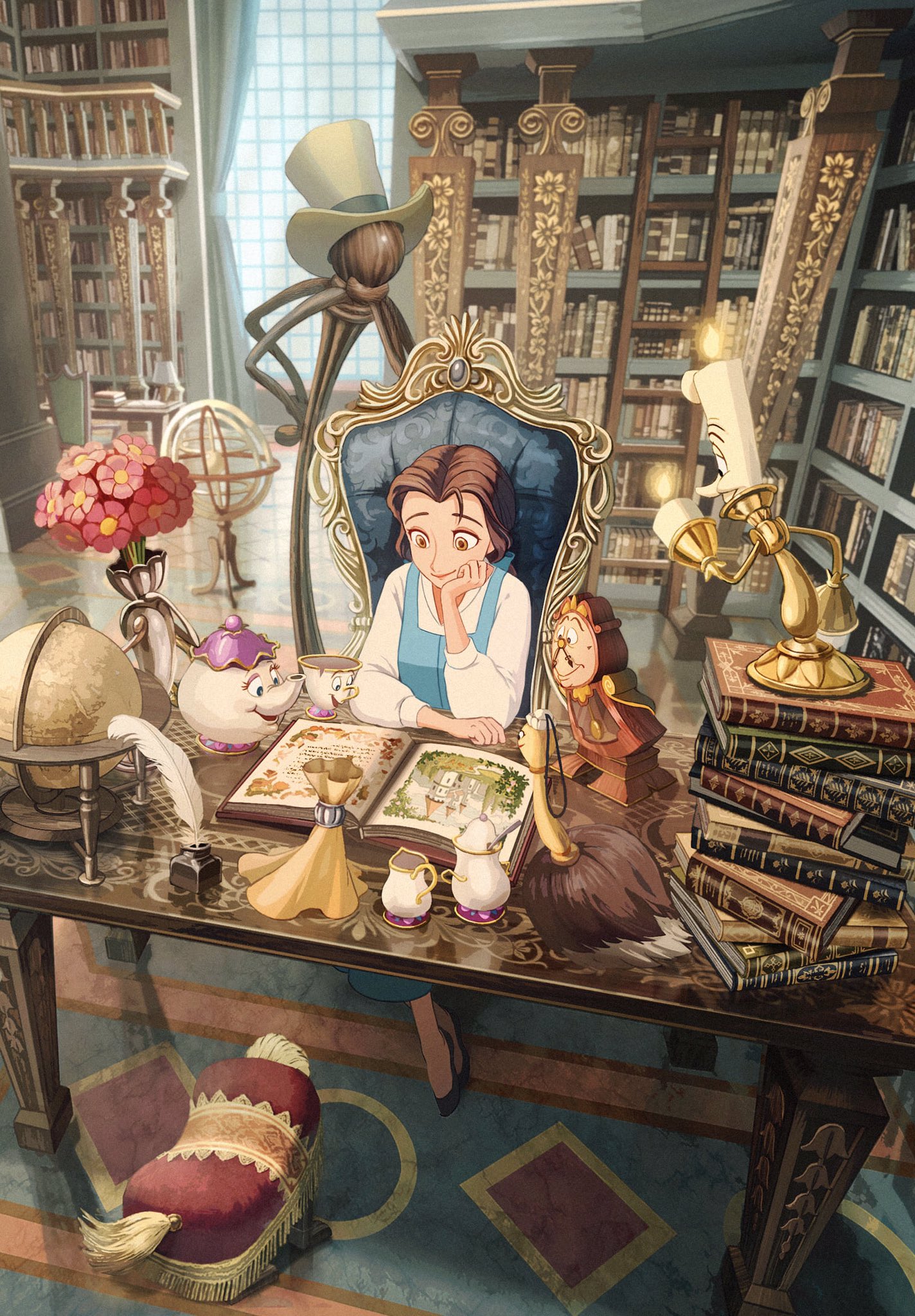 1girl absurdly_detailed_composition backlighting blue_dress book bookshelf brown_hair chair character_request clenched_hand clock closed_mouth commentary_request copyright_request cup curtains day disney dress flower forehead globe hand_on_own_chin highres indoors ink kurobe_(kurobe613) ladder loaded_interior long_hair long_sleeves looking_down low_ponytail on_chair open_book orange_eyes personification pinafore_dress ponytail quill red_flower shirt sitting sleeveless sleeveless_dress smile solo table teacup teapot white_shirt window