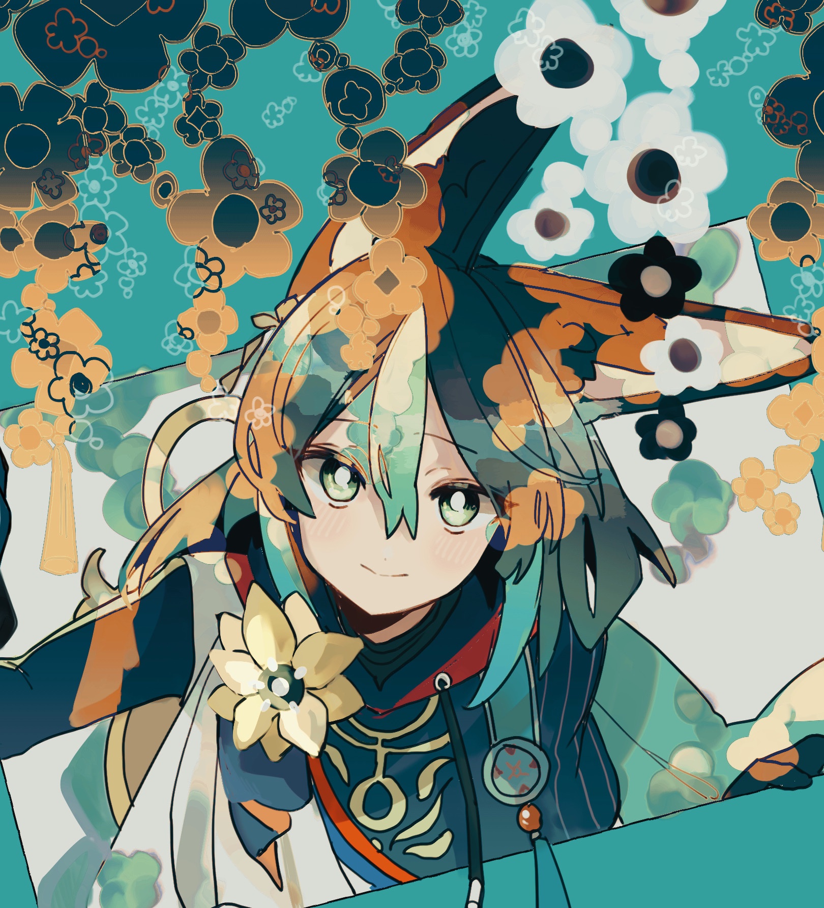 1boy animal_ears black_hair blush bob_cut closed_mouth commentary_request drawstring floral_background flower fox_ears genshin_impact green_hair green_hoodie highres hiyomikun hood hood_down hoodie looking_at_viewer male_focus multicolored_hair smile solo streaked_hair tassel tighnari_(genshin_impact) upper_body yellow_flower