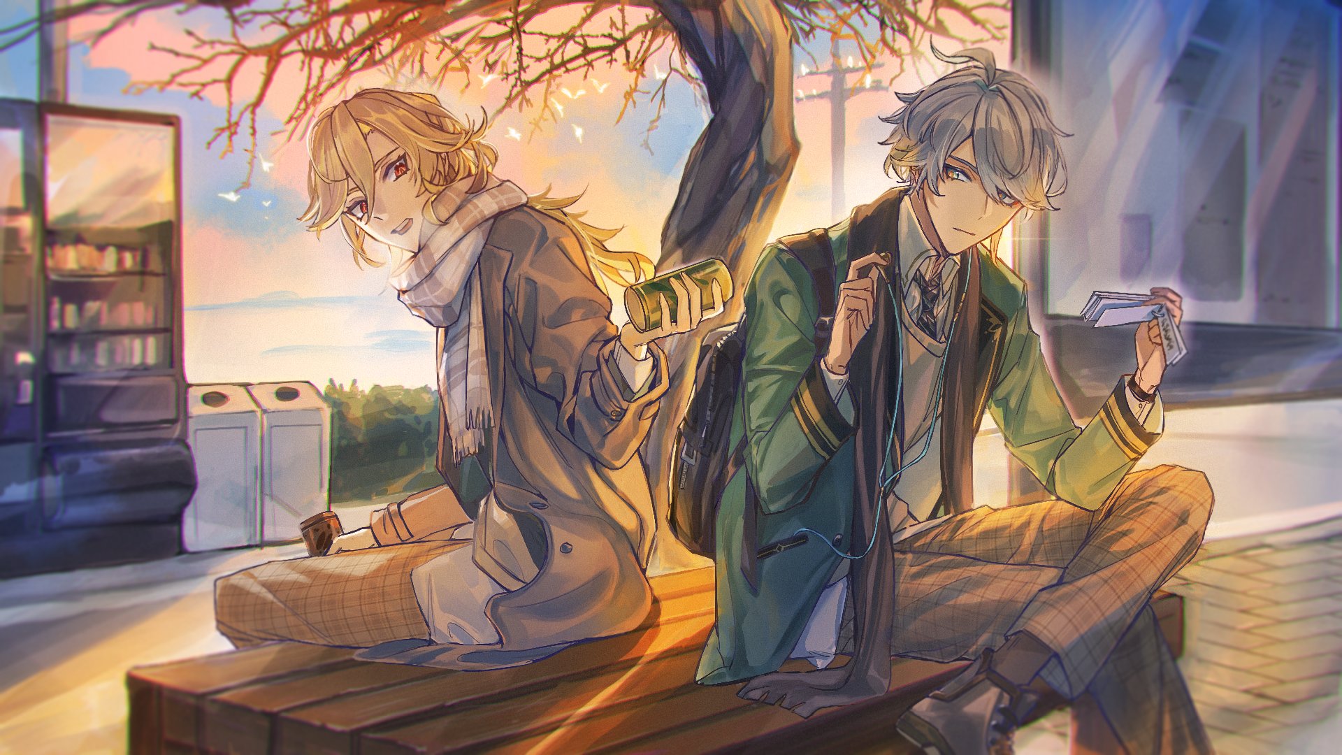 2boys ahoge alhaitham_(genshin_impact) alternate_costume bench bird black_footwear black_necktie black_scarf blonde_hair blue_eyes blue_hair blue_sky blush boots branch brown_pantyhose brown_shirt brown_vest building bush buttons can closed_mouth cloud cloudy_sky collared_jacket collared_shirt crossed_legs drink_can earphones earrings feather_hair_ornament feathers flying from_behind genshin_impact gold gold_earrings grass green_jacket grey_hair grey_jacket grey_scarf grey_shirt hair_between_eyes hair_ornament hand_up hands_up highres holding holding_can holding_earphones holding_notebook jacket jewelry kaveh_(genshin_impact) leaf leg_up light long_hair long_sleeves looking_at_another looking_back male_focus multicolored_hair multiple_boys necktie notebook on_bench open_clothes open_jacket open_mouth orange_pants outdoors pants pantyhose pink_sky plaid_clothes plaid_pants plaid_scarf pocket red_eyes road scarf shadow shirt short_hair sitting sky soda_can steam sunlight teeth tongue trash_can tree two-tone_hair vest window wing_collar wings ze123456n
