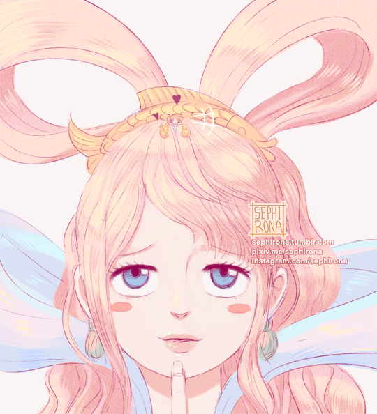 2girls blue_eyes blush_stickers feixianji_(hairstyle) finger_to_mouth giant giantess hair_rings heart long_hair mansherry_(one_piece) multiple_girls one_piece pink_hair portrait sephirona shirahoshi size_difference solo