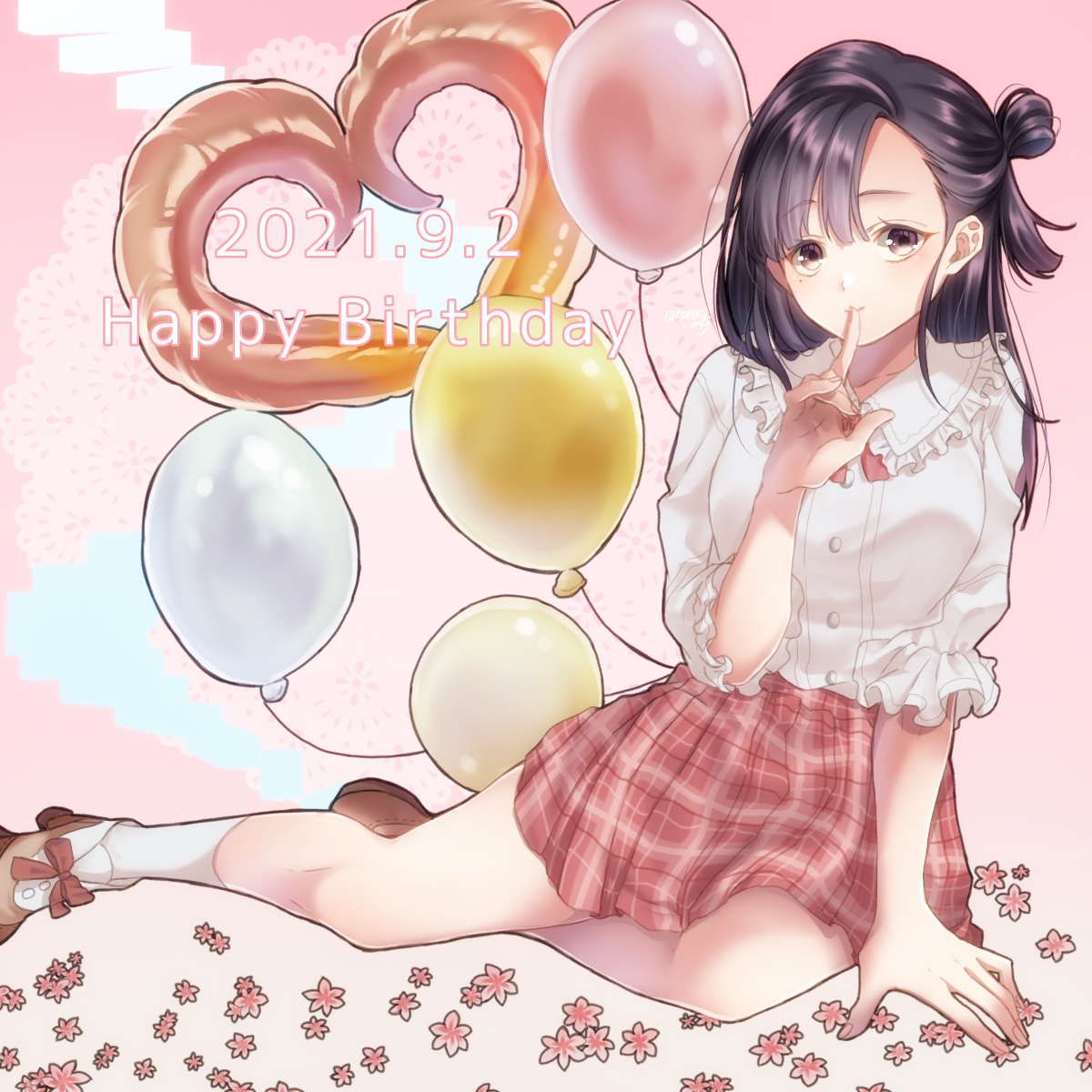 1girl 2021 asagi_nanase balloon blouse closed_mouth dated finger_to_mouth happy_birthday highres kashiki_yuno long_hair milgram mole mole_under_eye pink_shoes pink_skirt plaid_clothes plaid_skirt purple_eyes purple_hair shirt shoes short_sleeves shushing skirt smile socks solo white_shirt white_socks