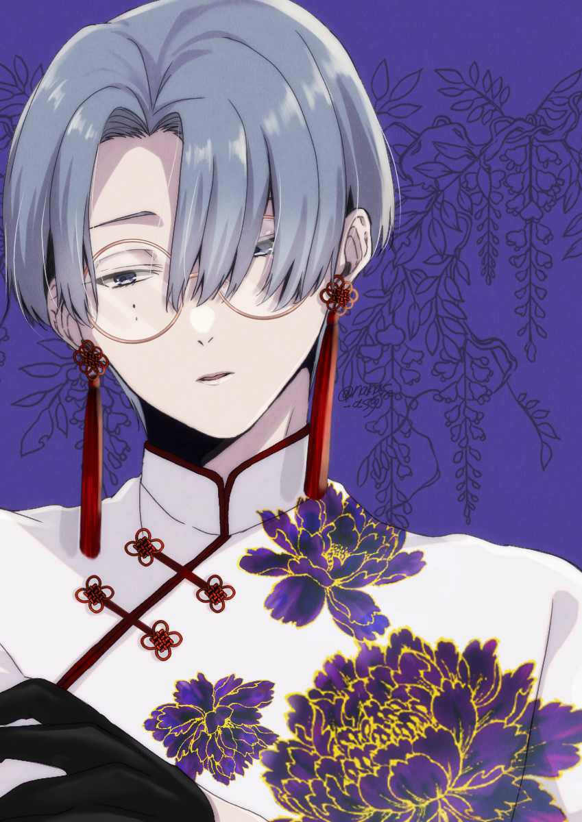 1boy asagi_nanase black_gloves china_dress chinese_clothes dress earrings facing_viewer floral_print glasses gloves grey_eyes grey_hair highres jewelry kirisaki_shidou looking_down male_focus milgram mole mole_under_eye parted_lips purple_background short_hair solo tassel tassel_earrings white_dress