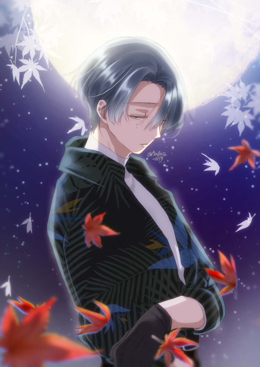 1boy asagi_nanase black_gloves black_jacket facing_to_the_side gloves grey_eyes grey_hair highres jacket kirisaki_shidou leaf long_sleeves looking_at_viewer male_focus maple_leaf milgram mole mole_under_eye moon necktie purple_background short_hair solo white_necktie