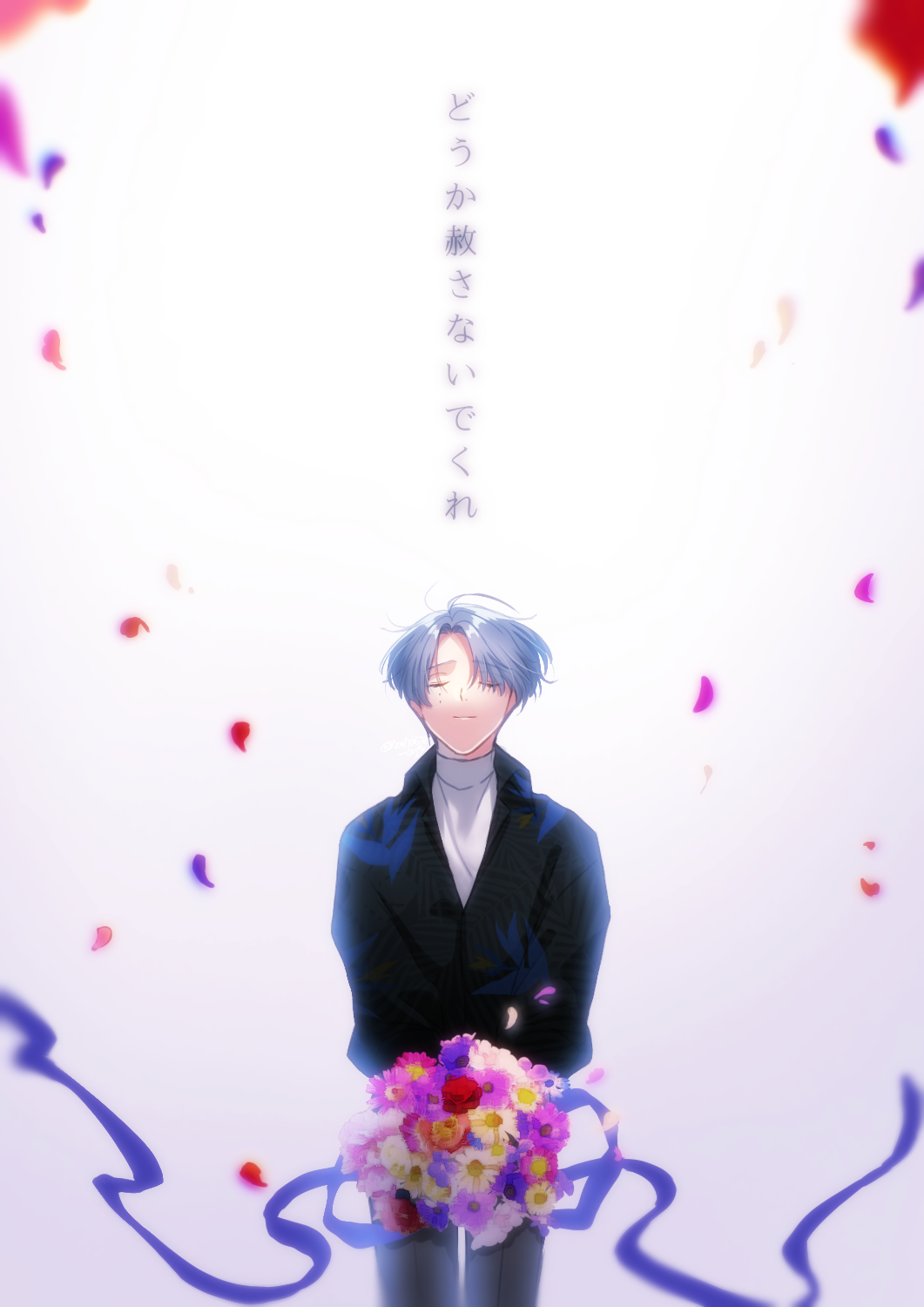 1boy asagi_nanase black_jacket bouquet closed_eyes flower grey_hair highres holding holding_bouquet jacket kirisaki_shidou long_sleeves male_focus milgram mole mole_under_eye pants short_hair solo sweater translation_request turtleneck turtleneck_sweater white_background white_sweater