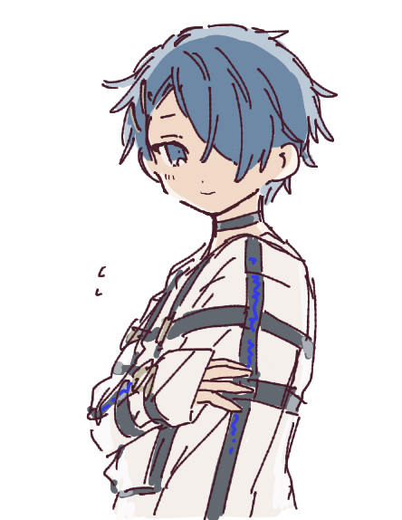 1boy black_choker blue_eyes blue_hair choker hair_over_one_eye jacket long_sleeves looking_at_viewer male_focus milgram sakurai_haruka_(milgram) short_hair sketch solo white_background white_jacket yayoripain