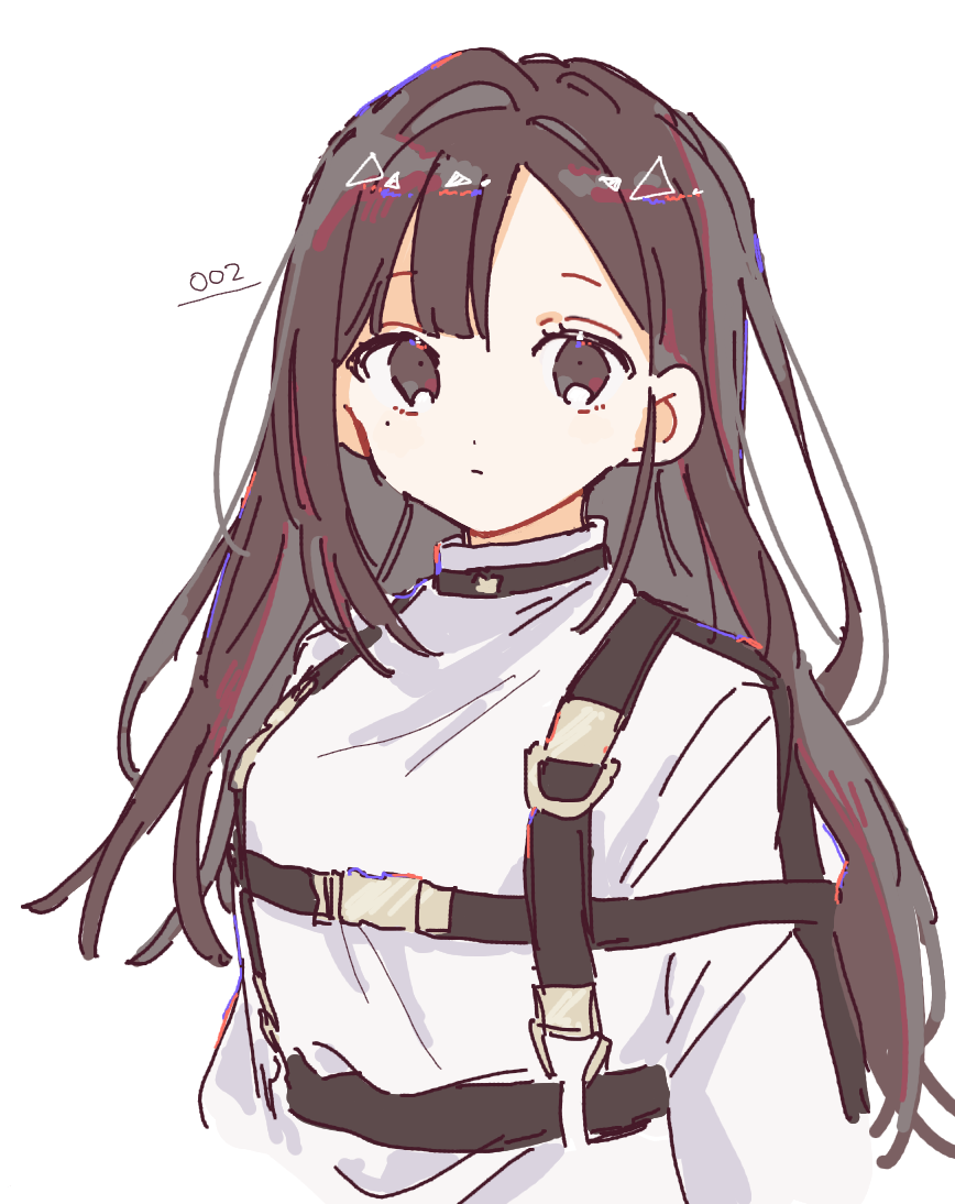 1girl black_choker brown_eyes brown_hair choker closed_mouth jacket kashiki_yuno long_hair long_sleeves looking_at_viewer milgram mole mole_under_eye sketch solo white_background white_jacket yayoripain