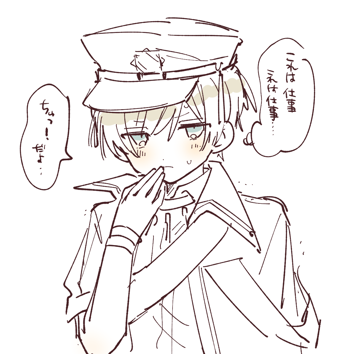 1other androgynous blush collared_jacket collared_shirt embarrassed es_(milgram) hand_on_own_face hat highres jacket long_sleeves looking_at_viewer milgram peaked_cap shirt sketch solo sweat translation_request yayoripain