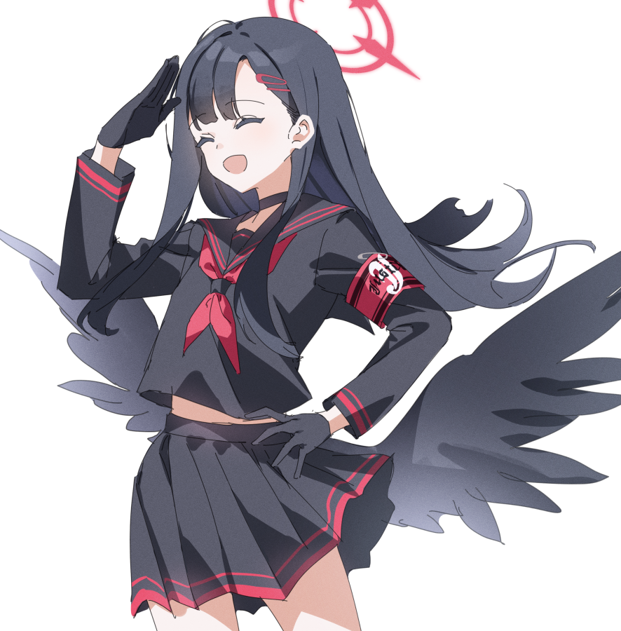1girl :d armband black_choker black_gloves black_hair black_sailor_collar black_skirt black_wings blue_archive choker closed_eyes gloves hair_ornament hairclip hand_on_own_hip ichika_(blue_archive) long_hair low_wings neckerchief nekoln open_mouth pleated_skirt red_armband red_neckerchief sailor_collar school_uniform skirt smile solo wings