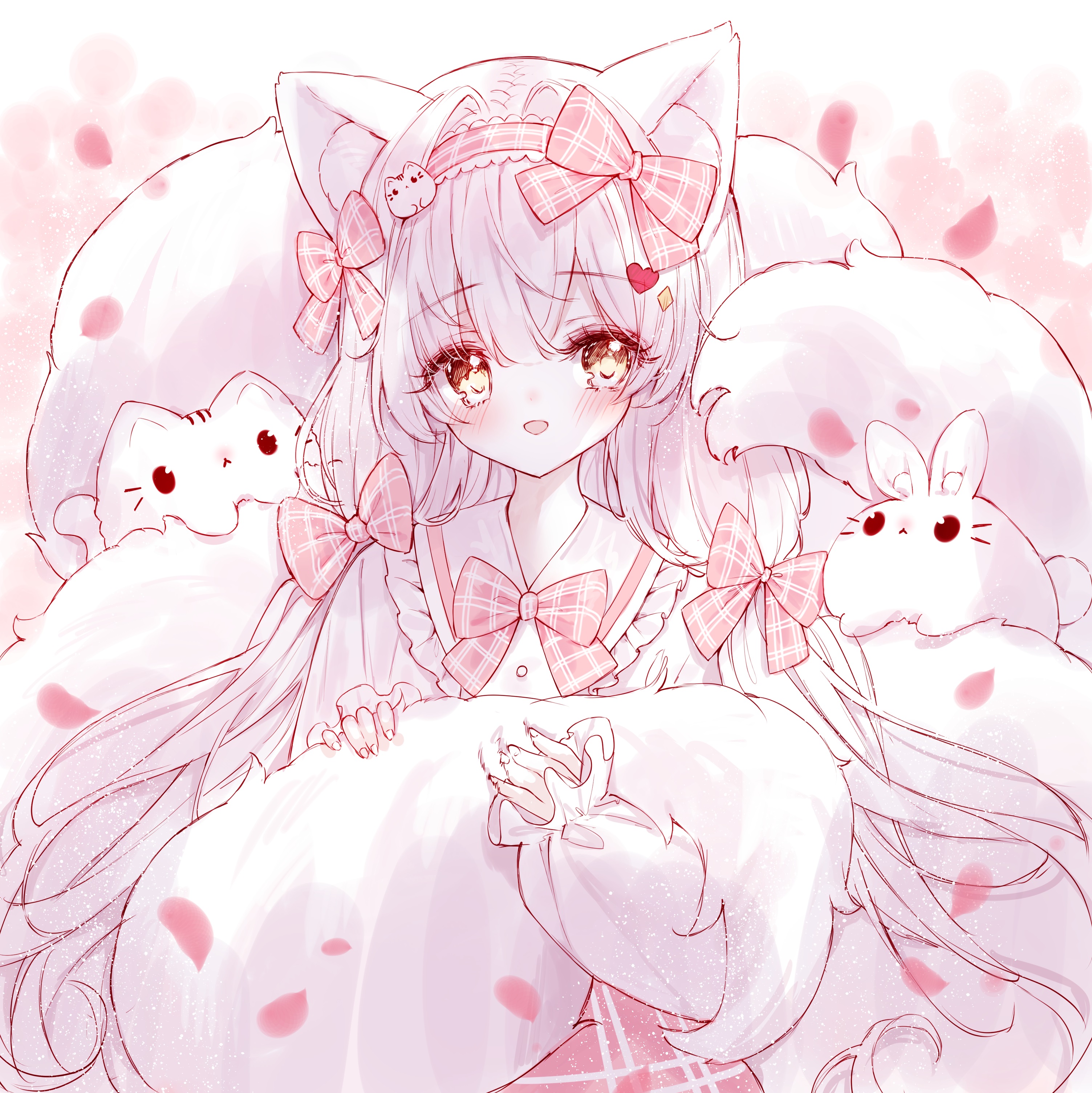 1girl :d absurdres animal animal_ear_fluff animal_ears blush bow brown_eyes cat collared_shirt commentary_request fox_ears fox_girl fox_tail frilled_shirt_collar frills hair_between_eyes hair_bow hairband highres kitsune long_hair long_sleeves looking_at_viewer open_mouth original petals pink_bow pink_hairband pink_skirt puffy_long_sleeves puffy_sleeves rabbit shirt skirt sleeves_past_wrists smile solo tail tail_grab tandohark very_long_hair white_cat white_hair white_shirt