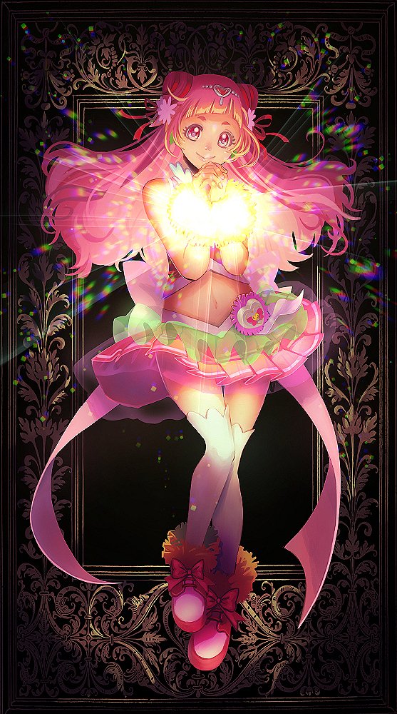 1girl black_background boots clover_earrings cone_hair_bun crop_top cure_yell frills full_body hair_bun hair_ornament heart heart_hair_ornament heart_pouch hugtto!_precure jj_(ssspulse) light navel nono_hana pink_boots pink_shirt pink_skirt pom_pom_(cheerleading) precure see-through_clothes see-through_sleeves shirt short_sleeves skirt solo thick_eyelashes thighhighs tiara white_thighhighs