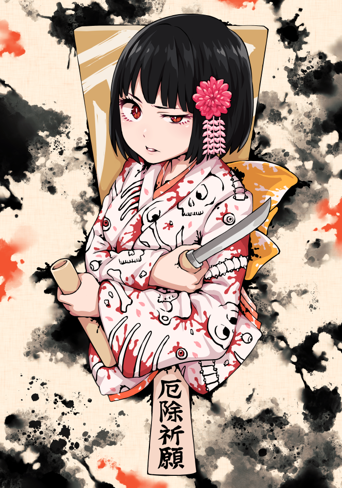 1girl back_bow black_hair bob_cut bone_print bow cropped_torso eyeball flower hagoita hair_flower hair_ornament hanetsuki holding holding_knife japanese_clothes kimono knife long_sleeves looking_at_viewer new_year original paddle pink_flower print_kimono red_eyes ribs short_hair skull solo spine translation_request upper_body wide_sleeves yajirushi_(chanoma) yellow_bow