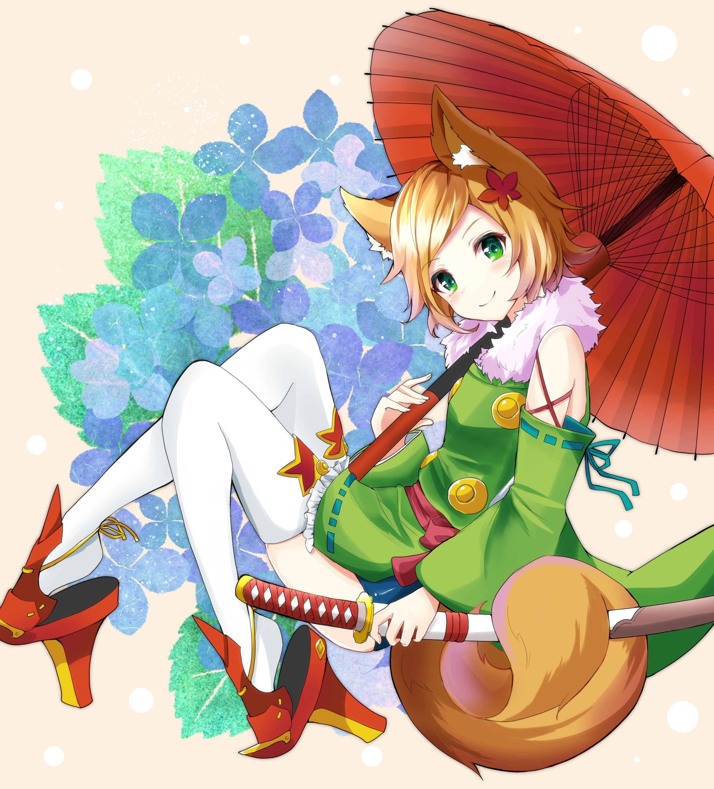 absurdres animal_ears bare_shoulders detached_sleeves dress floral_background flower fox_ears fox_girl fox_tail fur_trim geta green_dress green_eyes hair_ornament highres holding holding_weapon hydrangea japanese_clothes kariginu katana kogitsunemaru_(tenka_hyakken) leaf maple_leaf nakatsu_kon oil-paper_umbrella orange_hair parted_bangs sheath sheathed short_hair sword tail tengu-geta tenka_hyakken thighhighs umbrella weapon wide_sleeves