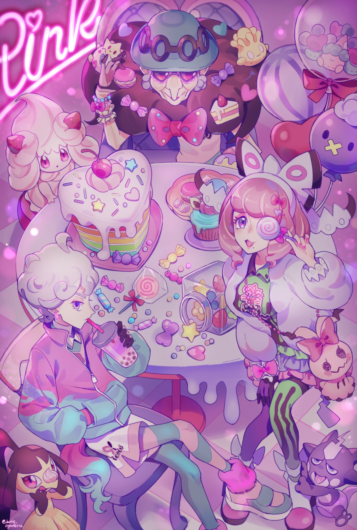 1boy 2girls ahoge alcremie alcremie_(strawberry_sweet) balloon bede_(pokemon) bubble_tea cake candy candy_wrapper chair collared_shirt commentary_request cup cupcake curly_hair drifloon drinking drinking_straw food fur_jacket fur_scarf gen_2_pokemon gen_3_pokemon gen_4_pokemon gen_7_pokemon gen_8_pokemon gloves green_headwear green_shirt hat hatenna highres holding holding_cup jacket janis_(hainegom) klara_(pokemon) mawile milcery mimikyu multiple_girls nintendo opal_(pokemon) plate pokemon pokemon_(creature) pokemon_sword_and_shield purple_eyes shirt short_hair sitting table thighhighs togepi toxel wrapped_candy zipper_pull_tab