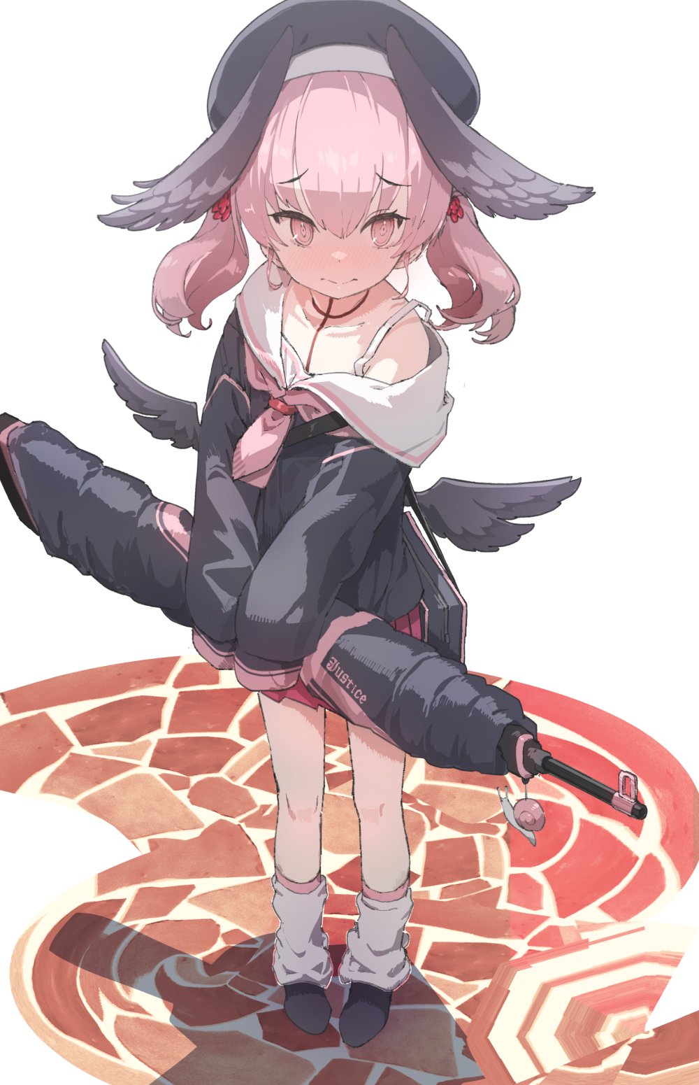 1girl beret black_hat black_wings blue_archive bolt_action feathered_wings flower grey_wings gun hair_flower hair_ornament halo hat head_wings highres hoshi_umi koharu_(blue_archive) long_sleeves loose_socks low_wings miniskirt neckerchief p14_enfield pink_eyes pink_hair pink_neckerchief rifle sailor_collar shoes skirt sleeves_past_wrists socks solo twintails weapon white_sailor_collar wings