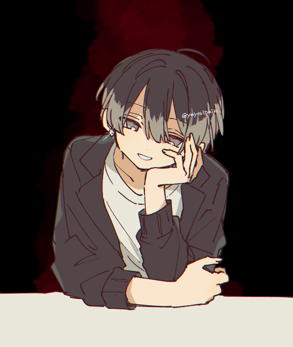 1boy ahoge black_background black_jacket brown_eyes brown_hair grey_hair jacket kayano_mikoto long_sleeves looking_at_viewer male_focus milgram multicolored_background multicolored_hair red_background shirt short_hair smile solo teeth twitter_username white_shirt yayoripain