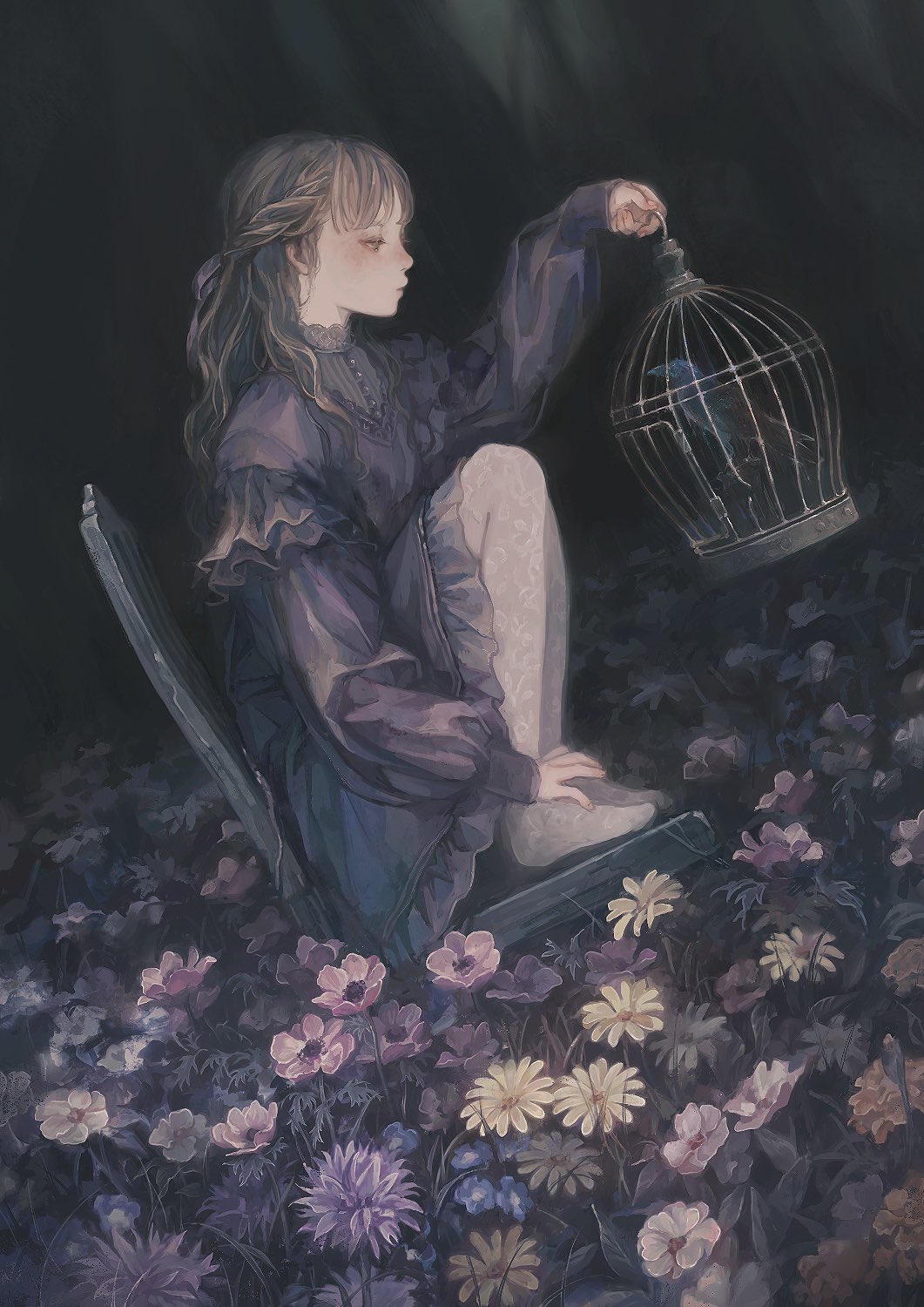 1girl bird birdcage blunt_bangs braid brown_eyes brown_hair buttons cage chair crow daisy_(flower) dress dutch_angle expressionless field flower flower_field frilled_dress frilled_sleeves frills from_side full_body grass hair_ribbon half-closed_eyes half_updo hand_on_own_foot hand_up highres holding holding_cage hotatenshi lace lace_legwear lace_pantyhose leaf long_hair looking_down meadow on_chair on_ground original outdoors pantyhose pink_flower profile purple_dress purple_flower ribbon single_braid solo squatting wavy_hair white_pantyhose yellow_flower