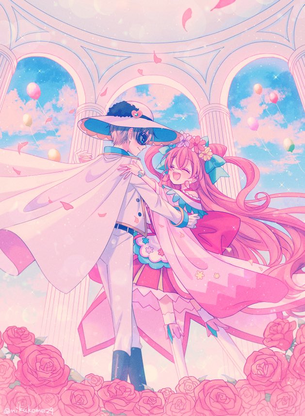 1boy 1girl apron back_bow balloon black_pepper_(precure) blue_eyes bow cape closed_eyes cone_hair_bun cure_precious cure_precious_(party_up_style) dancing delicious_party_precure domino_mask earrings eye_mask gloves grey_hair hair_bun head_wreath huge_bow jewelry long_hair magical_girl mask nachuko_(nikukome29) nagomi_yui petals pink_bow pink_hair precure shinada_takumi smile two_side_up very_long_hair watch white_cape white_gloves white_headwear wristwatch