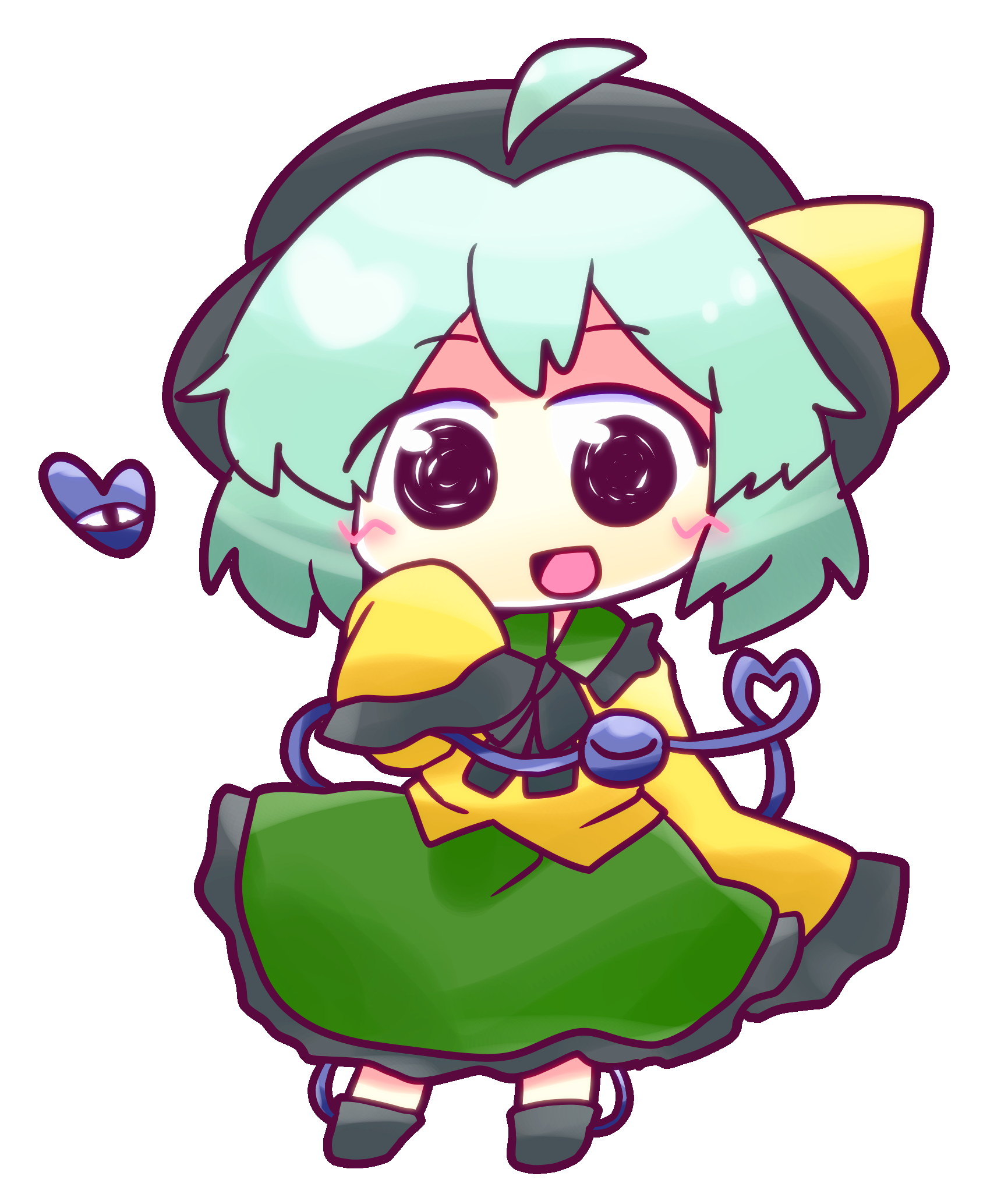 1girl ahoge black_hat black_ribbon chibi collared_shirt commentary green_hair green_skirt hand_up hat hat_ribbon heart highres komeiji_koishi long_sleeves neck_ribbon no_nose open_mouth ribbon shirt short_hair simple_background skirt sleeves_past_fingers sleeves_past_wrists smile solo third_eye touhou transparent_background yamadakyou_kurotan yellow_shirt