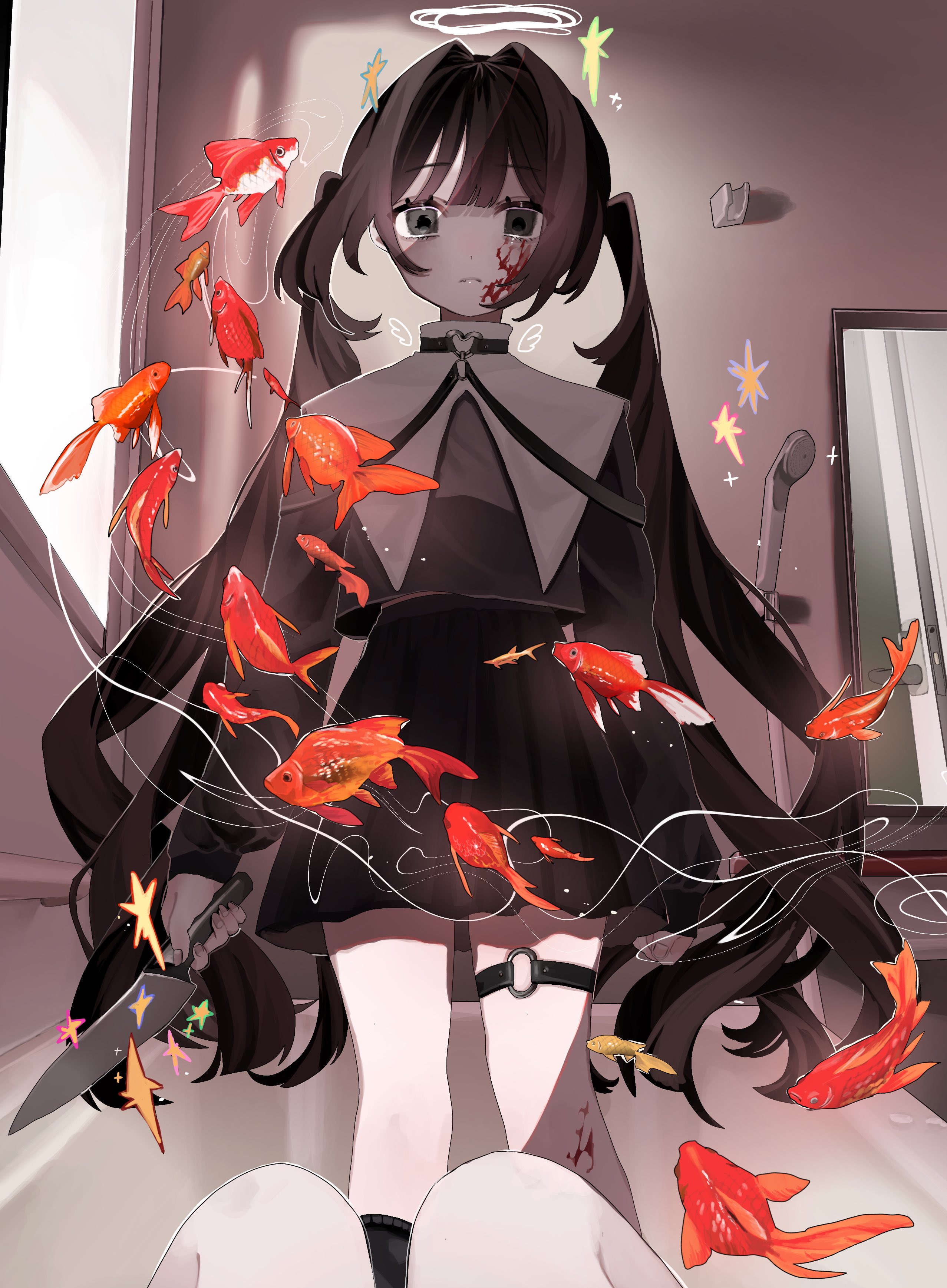 1girl 1other absurdres bad_id bad_twitter_id bathroom bathtub black_hair black_shirt black_skirt blood blood_on_face blood_on_leg commentary_request expressionless fish flying_fish grey_eyes halo hanataro_(sruvhqkehy1zied) highres holding holding_knife indoors knife long_hair looking_at_viewer mini_wings mirror original pov shirt shower_head skirt solo_focus sparkle thigh_strap twintails very_long_hair wavy_eyes wings
