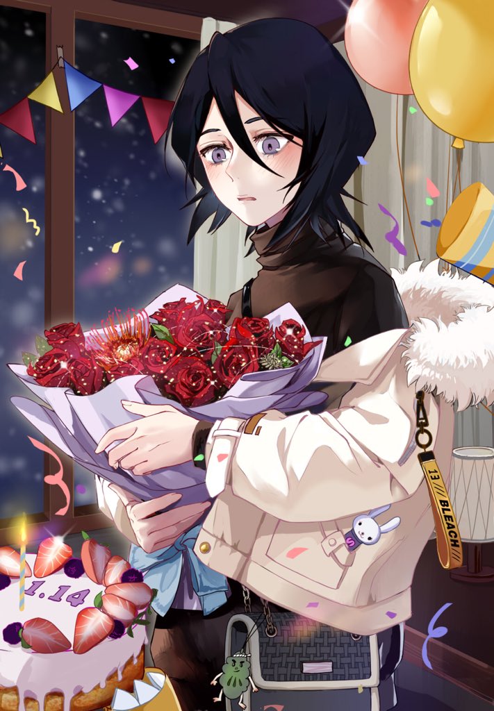 1girl bag balloon black_hair black_shirt black_skirt bleach blush bouquet cake candle choro-nakini commentary_request confetti curtains dated fire flower food fruit fur-trimmed_jacket fur_trim hair_between_eyes hugging_object indoors jacket kuchiki_rukia off_shoulder open_clothes open_jacket parted_lips party_popper pennant purple_eyes red_flower red_rose rose shirt shoulder_bag skirt snowing solo spider_lily strawberry streamers string_of_flags turtleneck white_jacket window