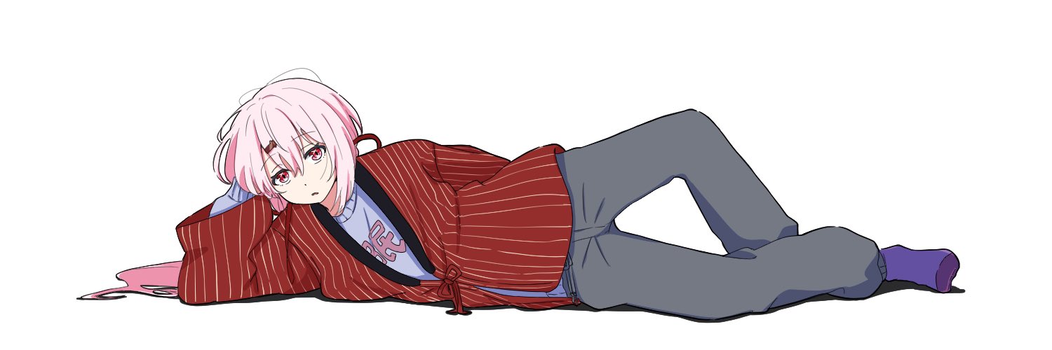 1girl 44gii full_body grey_pants head_rest long_hair long_sleeves low_ponytail lying nijisanji on_side pants pink_hair ponytail purple_socks red_eyes shiina_yuika simple_background socks solo striped vertical_stripes virtual_youtuber white_background wide_sleeves