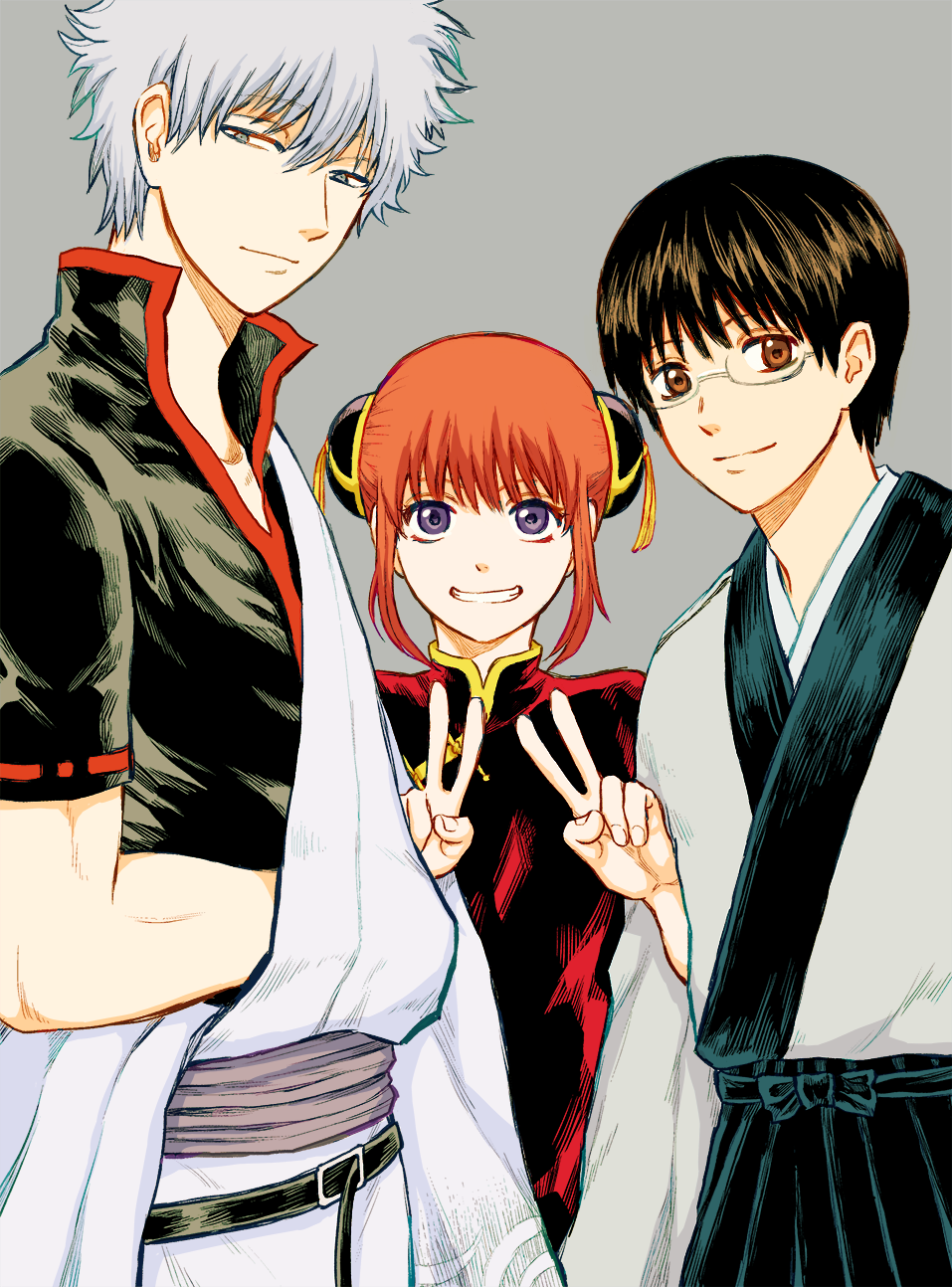 1girl 2boys black_hair blue_eyes brown_hair bun_cover chinese_clothes clenched_teeth commentary_request gintama glasses grey_eyes grey_hair highres japanese_clothes kagura_(gintama) looking_at_viewer multiple_boys ohi_bis orange_hair sakata_gintoki shimura_shinpachi short_hair sidelocks simple_background smile teeth v