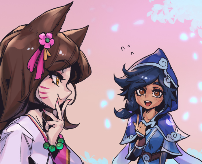 :d ahri_(league_of_legends) bead_bracelet beads belt black_hair blue_dress bracelet brown_belt brown_eyes brown_hair dress dynasty_ahri facial_mark flower freckles freljord_taliyah gradient_background hair_flower hair_ornament hand_on_own_chin hand_up hood hood_up index_finger_raised jewelry league_of_legends long_hair looking_at_another official_alternate_costume open_mouth petals phantom_cross pink_background pink_flower portrait profile smile ssg_taliyah taliyah teeth upper_teeth_only whisker_markings
