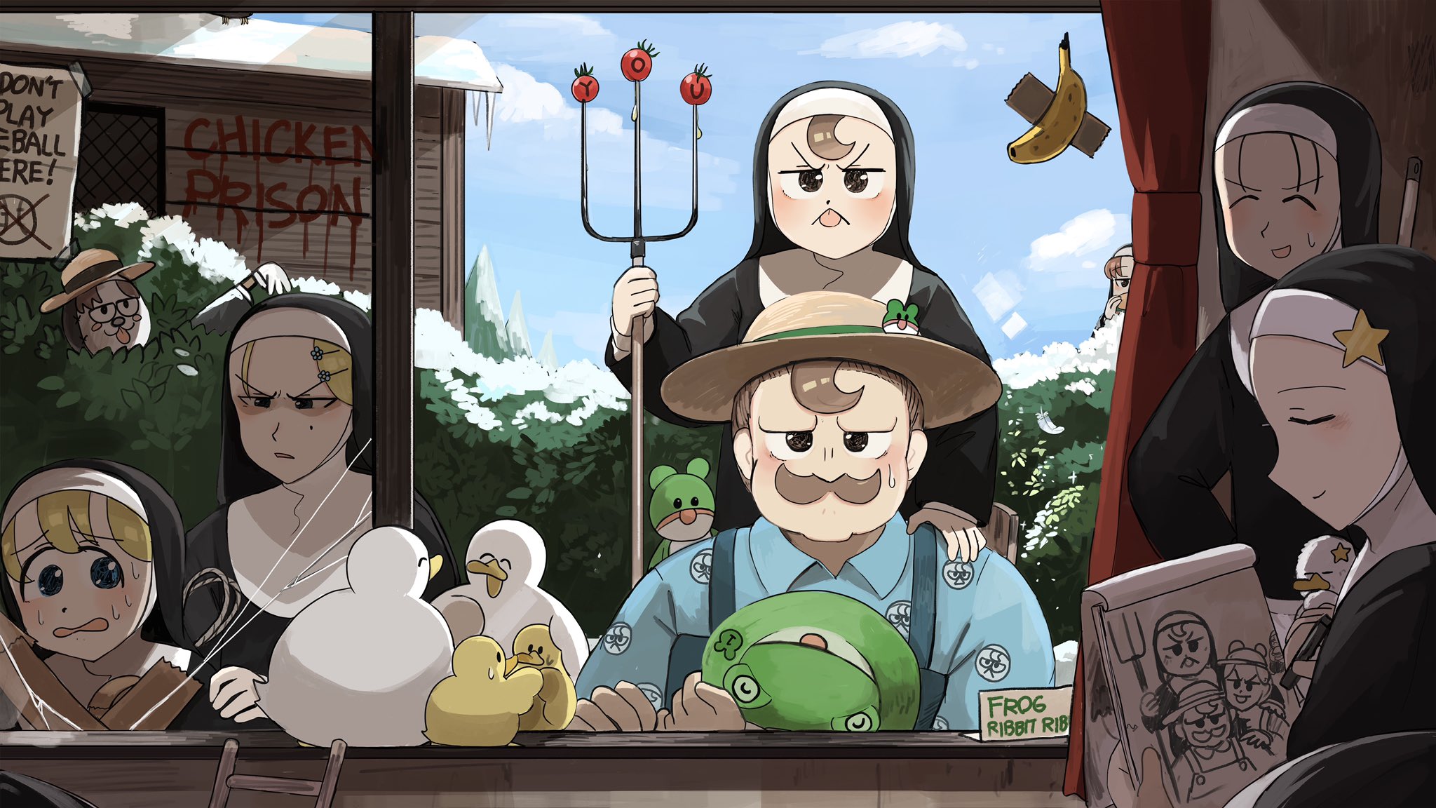 1boy 6+girls baby_animal banana bird black_hair blonde_hair blue_eyes broken_window brown_eyes brown_hair burger bush chicken clumsy_nun_(diva) commentary diva_(hyxpk) drawing duck duckling eating english_commentary facial_hair flower food freckles_nun_(diva) froggy_nun's_father_(diva) froggy_nun_(diva) fruit habit hair_flower hair_ornament hairpin hat highres holding holding_pitchfork holding_unworn_clothes holding_unworn_hat hungry_nun_(diva) ladder little_nuns_(diva) mole mole_on_cheek multiple_girls mustache note nun nun_headdress pencil pitchfork slice_of_life snow star_nun_(diva) star_ornament strict_nun_(diva) traditional_nun unworn_hat unworn_headwear