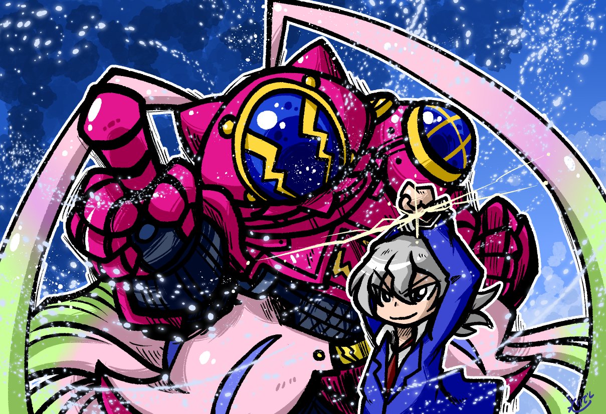1boy 1girl amphimon android blue_eyes digimon digimon_ghost_game gynoid higashimitarai_kiyoshiro mecha_girl robot_girl short_hair size_difference white_hair
